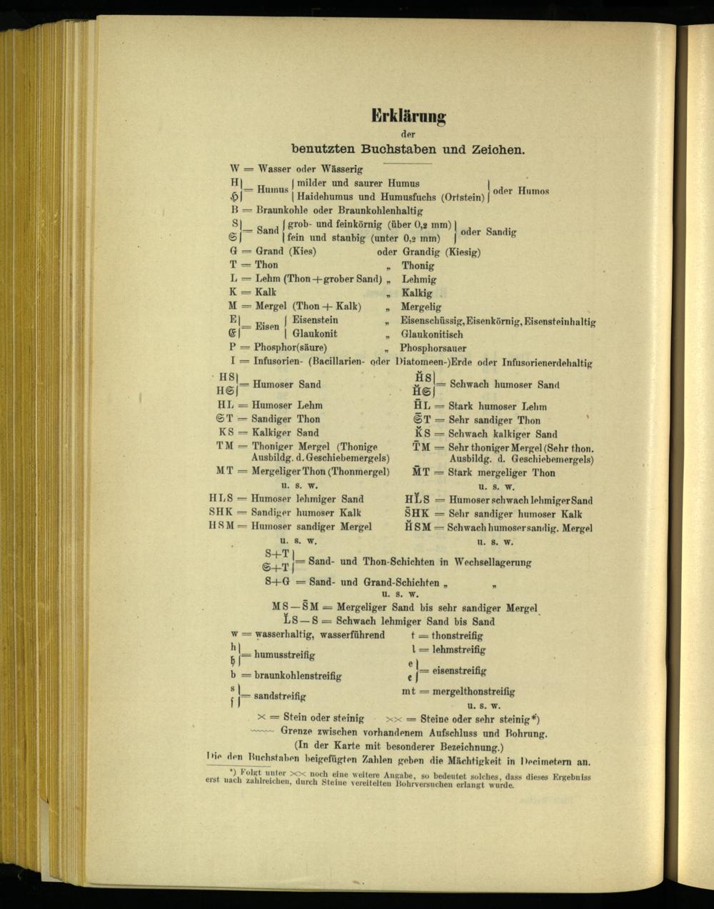 $)_ sandstreifig mt= mergelthonstreifig {1 u. 8. W. X= Stein oder steinig x= Steine oder sehr steinig*) —— Grenze zwischen vorhandenem Aufschluss und Bohrung. (In der Karte mit besonderer Bezeichnung.) Die den Buchstaben beigefügten Zahlen geben die Mächtigkeit in leeimetern an.