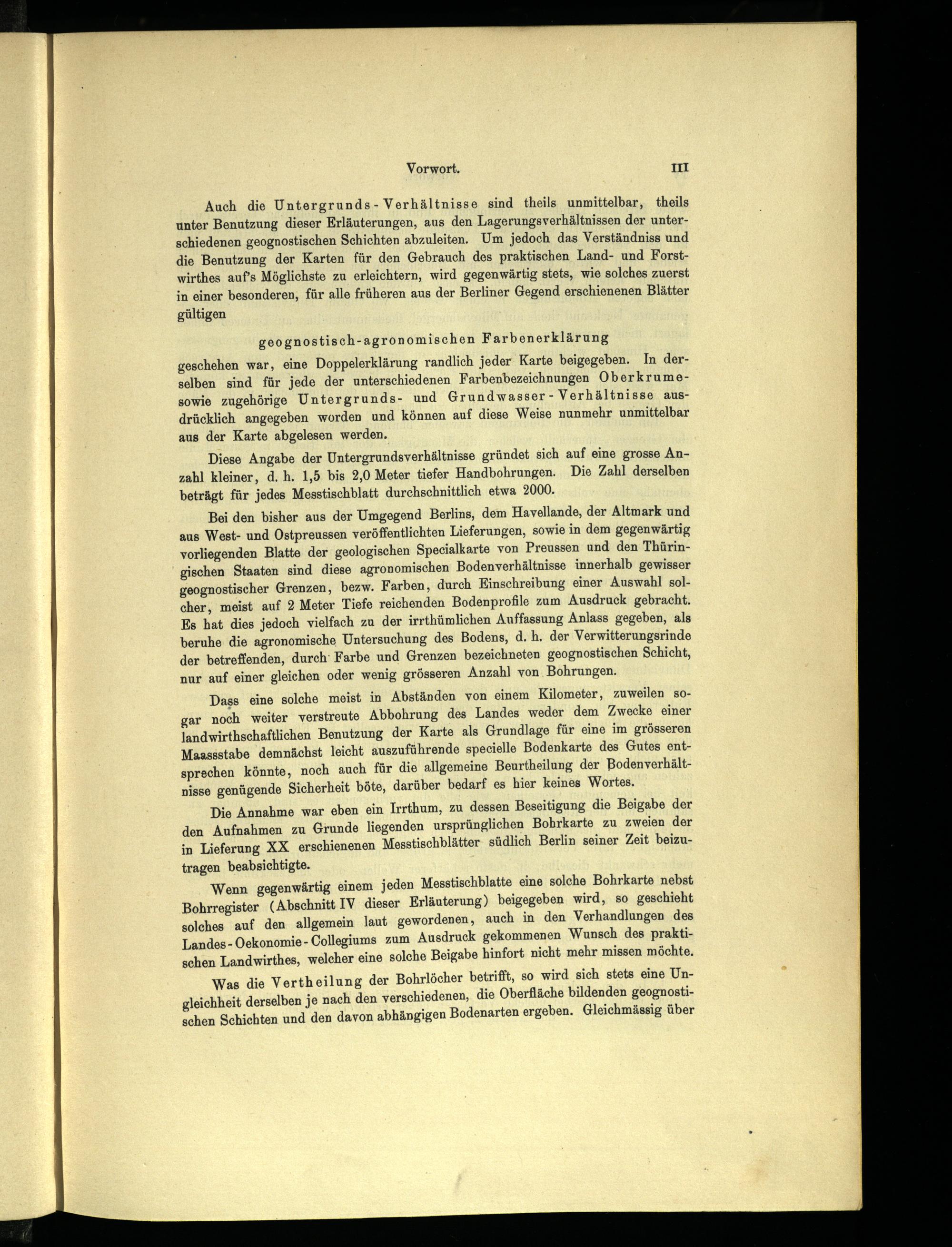 Auch die Untergrunds- Verhältnisse sind theils unmittelbar, theils unter Benutzung dieser Erläuterungen, aus den Lagerungsverhältnissen der unterschiedenen geognostischen Schichten abzuleiten. Um jedoch das Verständniss und die Benutzung der Karten für den Gebrauch des praktischen Land- und Forstwirthes auf’s Möglichste zu erleichtern, wird gegenwärtig stets, wie solches zuerst in einer besonderen, für alle früheren aus der Berliner Gegend erschienenen Blätter gültigen
