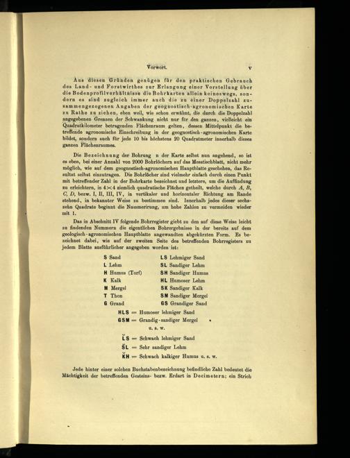 Das in Abschnitt IV folgende Bohrregister giebt zu den auf diese Weise leicht zu findenden Nummern die eigentlichen Bohrergebnisse in der bereits auf dem geologisch- agronomischen Hauptblatte angewandten abgekürzten Form. Es bezeichnet dabei, wie auf der zweiten Seite des betreffenden Bohrregisters zu jedem Blatte ausführlicher angegeben worden ist: