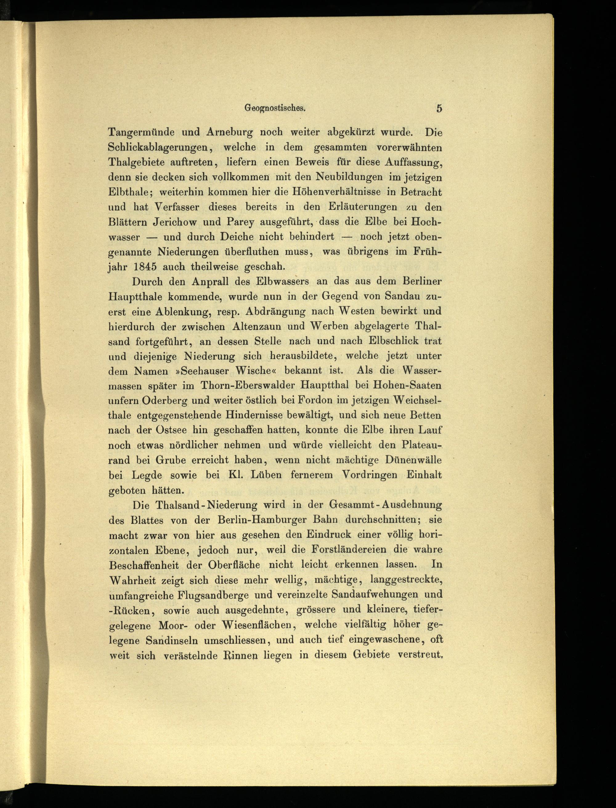 Durch den Anprall des Elbwassers an das aus dem Berliner Hauptthale kommende, wurde nun in der Gegend von Sandau zuerst eine Ablenkung, resp. Abdrängung nach Westen bewirkt und hierdurch der zwischen Altenzaun und Werben abgelagerte Thalsand fortgeführt, an dessen Stelle nach und nach Elbschlick trat und diejenige Niederung sich herausbildete, welche jetzt unter dem Namen»Seehauser Wische« bekannt ist. Als die Wassermassen später im Thorn-Eberswalder Hauptthal bei Hohen-Saaten unfern Oderberg und weiter östlich bei Fordon im jetzigen Weichselthale entgegenstehende Hindernisse bewältigt, und sich neue Betten nach der Ostsee hin geschaffen hatten, konnte die Elbe ihren Lauf noch etwas nördlicher nehmen und würde vielleicht den Plateaurand bei Grube erreicht haben, wenn nicht mächtige Dünenwälle bei Legde sowie bei Kl. Lüben fernerem Vordringen Einhalt geboten hätten.