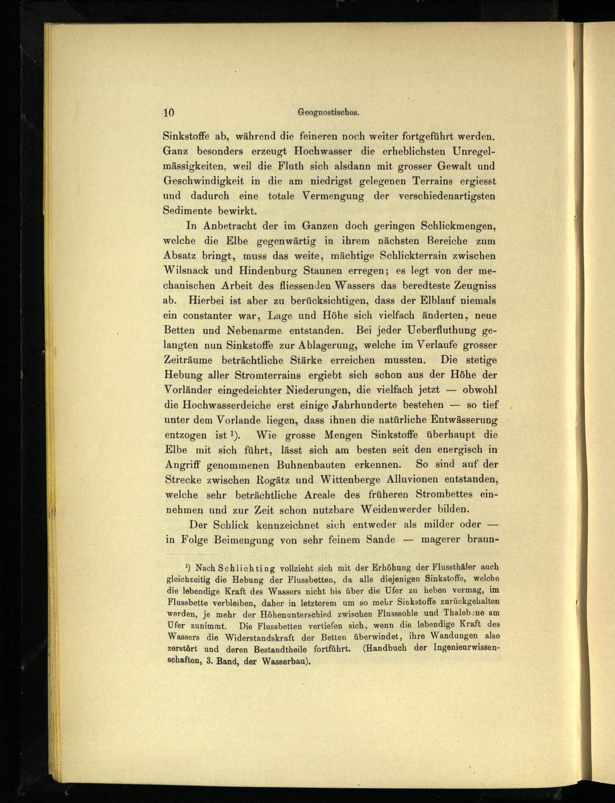 1) Nach Schlichting vollzieht sich mit der Erhöhung der Flussthäler auch gleichzeitig die Hebung der Flussbetten, da alle diejenigen Sinkstoffe, welche die lebendige Kraft des Wassers nicht bis über die Ufer zu heben vermag, im| Flussbette verbleiben, daher in letzterem um so mehr Sinkstoffe zurückgehalten r werden, je mehr der Höhenunterschied zwischen Flusssohle und Thalebone am Ufer zunimmt. Die Flussbetten vertiefen sich, wenn die lebendige Kraft des Wassers die Widerstandskraft der Betten überwindet, ihre Wandungen also zerstört und deren Bestandtheile fortführt.(Handbuch der Ingenieurwissenschaften, 3. Band, der Wasserbau),