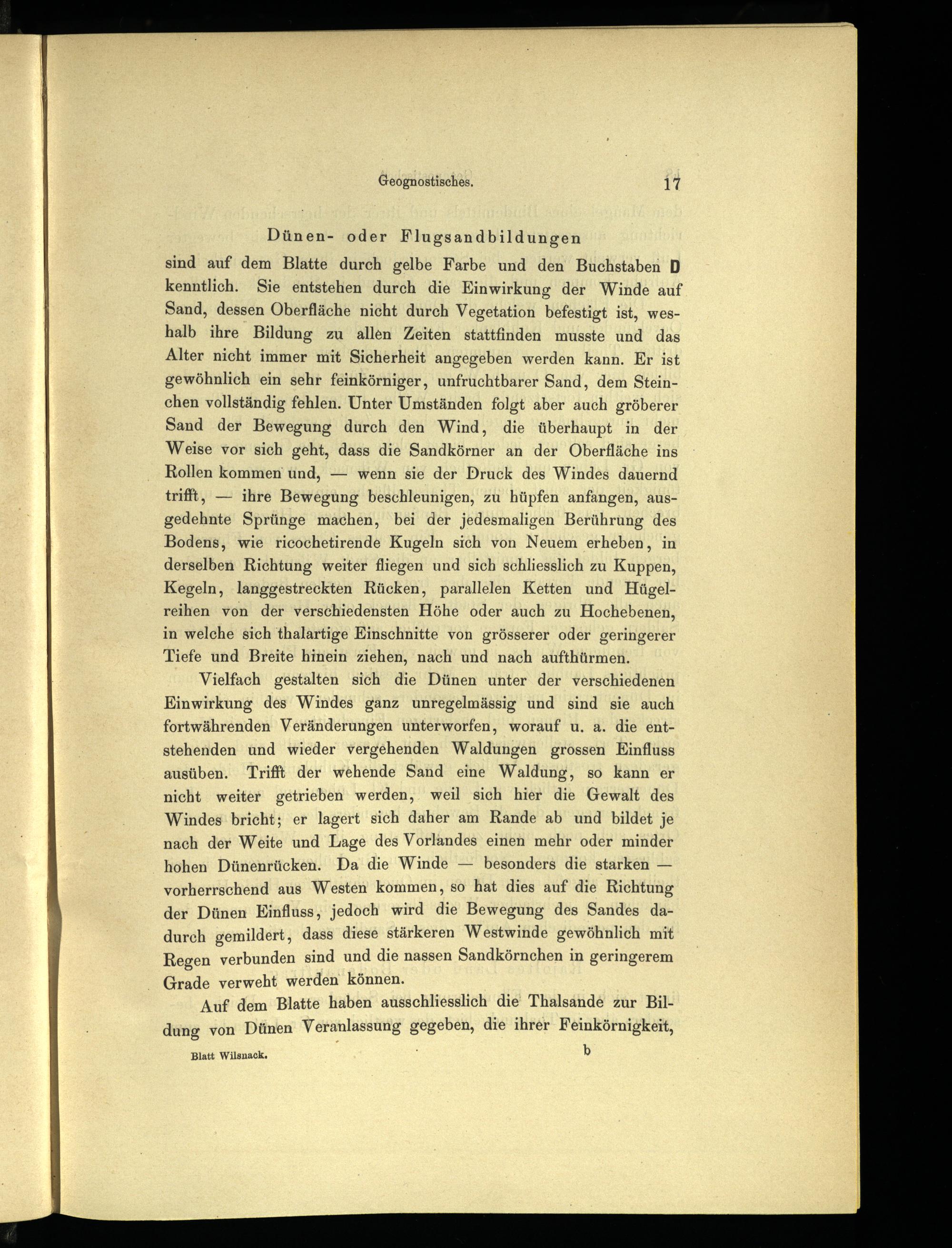 sind auf dem Blatte durch gelbe Farbe und den Buchstaben D kenntlich. Sie entstehen durch die Einwirkung der Winde auf Sand, dessen Oberfläche nicht durch Vegetation befestigt ist, weshalb ihre Bildung zu allen Zeiten stattfinden musste und das Alter nicht immer mit Sicherheit angegeben werden kann. Er ist gewöhnlich ein sehr feinkörniger, unfruchtbarer Sand, dem Steinchen vollständig fehlen. Unter Umständen folgt aber auch gröberer Sand der Bewegung durch den Wind, die überhaupt in der Weise vor sich geht, dass die Sandkörner an der Oberfläche ins Rollen kommen und,— wenn sie der Druck des Windes dauernd trifft,— ihre Bewegung beschleunigen, zu hüpfen anfangen, ausgedehnte Sprünge machen, bei der jedesmaligen Berührung des Bodens, wie ricochetirende Kugeln sich von Neuem erheben, in derselben Richtung weiter fliegen und sich schliesslich zu Kuppen, Kegeln, langgestreckten Rücken, parallelen Ketten und Hügelreihen von der verschiedensten Höhe oder auch zu Hochebenen, in welche sich thalartige Einschnitte von grösserer oder geringerer Tiefe und Breite hinein ziehen, nach und nach aufthürmen.