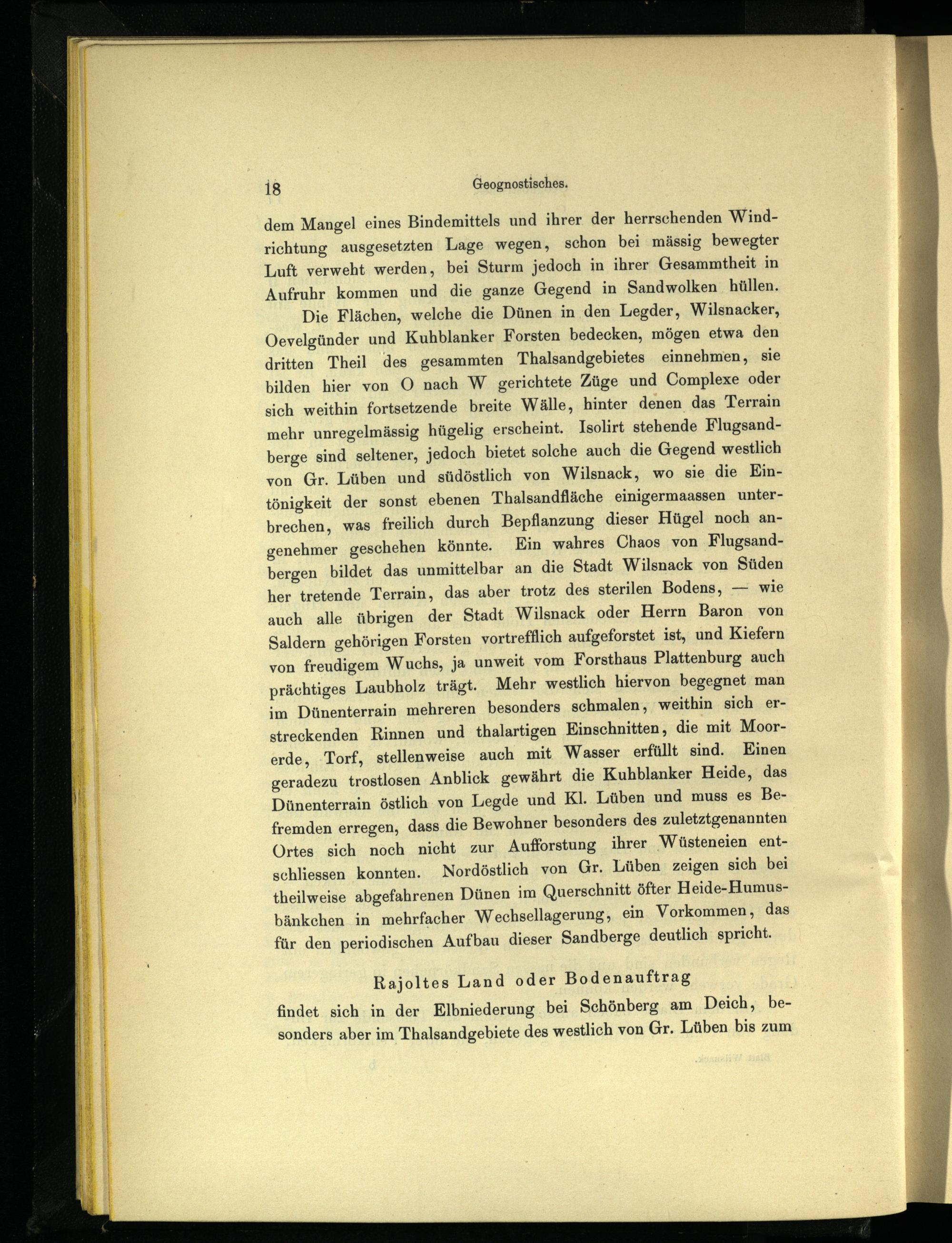 dem Mangel eines Bindemittels und ihrer der herrschenden Windrichtung ausgesetzten Lage wegen, schon bei mässig bewegter Luft verweht werden, bei Sturm jedoch in ihrer Gesammtheit in Aufruhr kommen und die ganze Gegend in Sandwolken hüllen. Die Flächen, welche die Dünen in ‚den Legder, Wilsnacker, Oevelgünder und Kuhblanker Forsten bedecken, mögen etwa den dritten Theil des gesammten Thalsandgebietes einnehmen, sie bilden hier von O nach W gerichtete Züge und Complexe oder sich weithin fortsetzende breite Wälle, hinter denen das Terrain mehr unregelmässig hügelig erscheint. Isolirt stehende Flugsandberge sind seltener, jedoch bietet solche auch die Gegend westlich von Gr. Lüben und südöstlich von Wilsnack, wo sie die Eintönigkeit der sonst ebenen Thalsandfläche einigermaassen unterbrechen, was freilich durch Bepflanzung dieser Hügel noch angenehmer geschehen könnte. Ein wahres Chaos von Flugsandbergen bildet das unmittelbar an die Stadt Wilsnack von Süden her tretende Terrain, das aber trotz des sterilen Bodens,— wie auch alle übrigen der Stadt Wilsnack oder Herrn Baron von Saldern gehörigen Forsten vortrefflich aufgeforstet ist, und Kiefern von freudigem Wuchs, ja unweit vom Forsthaus Plattenburg auch prächtiges Laubholz trägt. Mehr westlich hiervon begegnet man im Dünenterrain mehreren besonders schmalen, weithin sich erstreckenden Rinnen und thalartigen Einschnitten, die mit Moorerde, Torf, stellenweise auch mit Wasser erfüllt sind. Einen geradezu trostlosen Anblick gewährt die Kuhblanker Heide, das Dünenterrain östlich von Legde und Kl. Lüben und muss es Befremden erregen, dass die Bewohner besonders des zuletztgenannten Ortes sich noch nicht zur Aufforstung ihrer Wüsteneien entschliessen konnten. Nordöstlich von Gr. Lüben zeigen sich bei theilweise abgefahrenen Dünen im Querschnitt öfter Heide-Humusbänkehen in mehrfacher Wechsellagerung, ein Vorkommen, das für den periodischen Aufbau dieser Sandberge deutlich spricht.