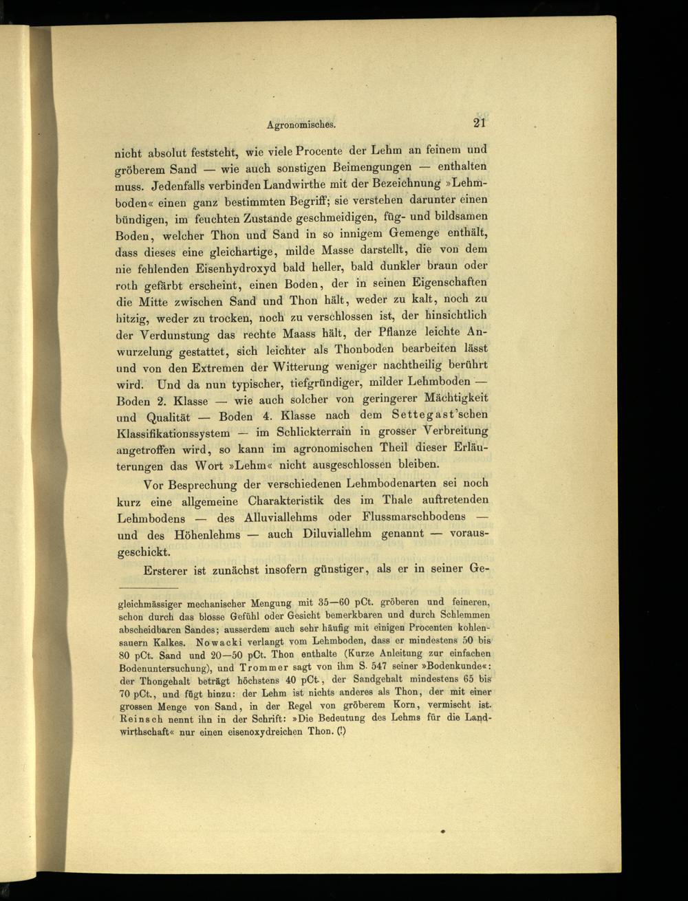 nicht absolut feststeht, wie viele Procente der Lehm an feinem und gröberem Sand— wie auch sonstigen Beimengungen— enthalten muss. Jedenfalls verbinden Landwirthe mit der Bezeichnung»Lehmboden« einen ganz bestimmten Begriff; sie verstehen darunter einen bündigen, im feuchten Zustande geschmeidigen, füg- und bildsamen Boden, welcher Thon und Sand in so innigem Gemenge enthält, dass dieses eine gleichartige, milde Masse darstellt, die von dem nie fehlenden Eisenhydroxyd bald heller, bald dunkler braun oder roth gefärbt erscheint, einen Boden, der in seinen Eigenschaften die Mitte zwischen Sand und Thon hält, weder zu kalt, noch zu hitzig, weder zu trocken, noch zu verschlossen ist, der hinsichtlich der Verdunstung das rechte Maass hält, der Pflanze leichte Anwurzelung gestattet, sich leichter als Thonboden bearbeiten lässt und von den Extremen der Witterung weniger nachtheilig berührt wird. Und da nun typischer, tiefgründiger, milder Lehmboden— Boden 2. Klasse— wie auch solcher von geringerer Mächtigkeit und Qualität— Boden 4. Klasse nach dem Settegast’schen Klassifikationssystem— im Schlickterrain in grosser Verbreitung angetroffen wird, so kann im agronomischen Theil dieser Erläuterungen das Wort»Lehm« nicht ausgeschlossen bleiben.