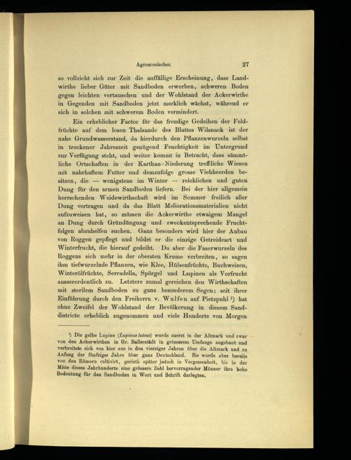 1) Die gelbe Lupine(Lupinus luteus) wurde zuerst in der Altmark und zwar von den Ackerwirthen in Gr. Ballerstädt in grösserem Umfange angebaut und verbreitete sich von hier aus in den vierziger Jahren über die Altmark und zu Anfang der fünfziger Jahre über ganz Deutschland. Sie wurde aber bereits von den Römern cultivirt, gerieth später jedoch in Vergessenheit, bis in der Mitte dieses Jahrhunderts eine grössere Zahl hervorragender Männer ihre hohe Bedeutung für den Sandboden in Wort und Schrift darlegten,
