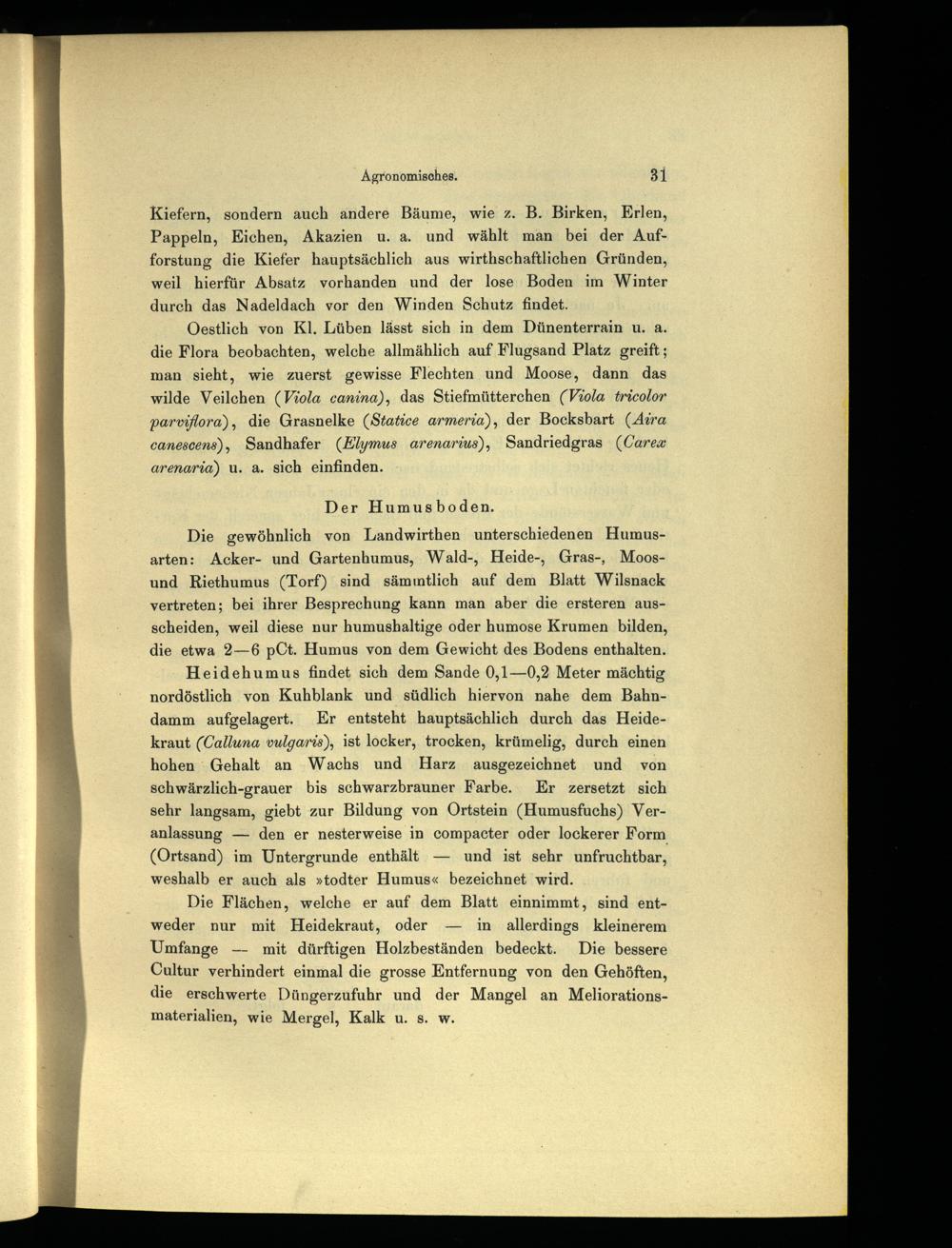 Heidehumus findet sich dem Sande 0,1—0,2 Meter mächtig nordöstlich von Kuhblank und südlich hiervon nahe dem Bahndamm aufgelagert. Er entsteht hauptsächlich durch das Heidekraut(Calluna vulgaris), ist locker, trocken, krümelig, durch einen hohen Gehalt an Wachs und Harz ausgezeichnet und von schwärzlich-grauer bis schwarzbrauner Farbe. Er zersetzt sich sehr langsam, giebt zur Bildung von Ortstein(Humusfuchs) Veranlassung— den er nesterweise in compacter oder lockerer Form (Ortsand) im Untergrunde enthält— und ist sehr unfruchtbar, weshalb er auch als»todter Humus« bezeichnet wird.
