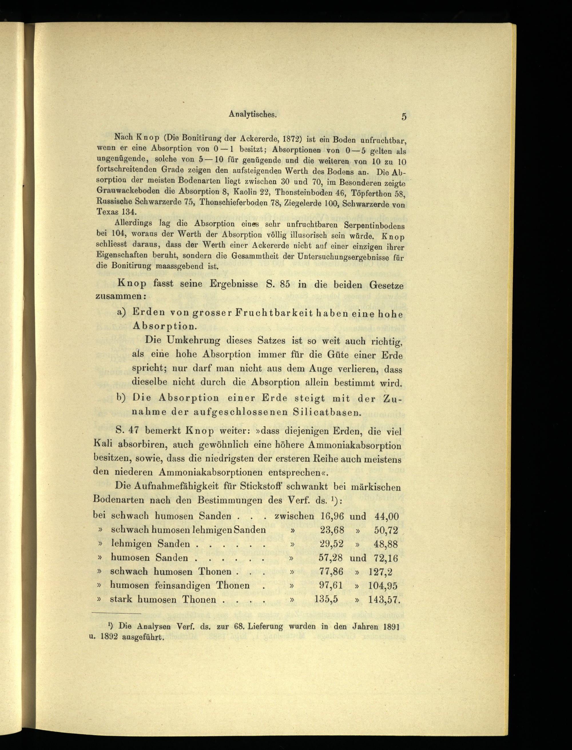 Allerdings lag die Absorption eines sehr unfruchtbaren Serpentinbodens bei 104, woraus der Werth der Absorption völlig illusorisch sein würde. Knop schliesst daraus, dass der Werth einer Ackererde nicht auf einer einzigen ihrer Eigenschaften beruht, sondern die Gesammtheit der Untersuchungsergebnisse für die Bonitirung maassgebend ist.