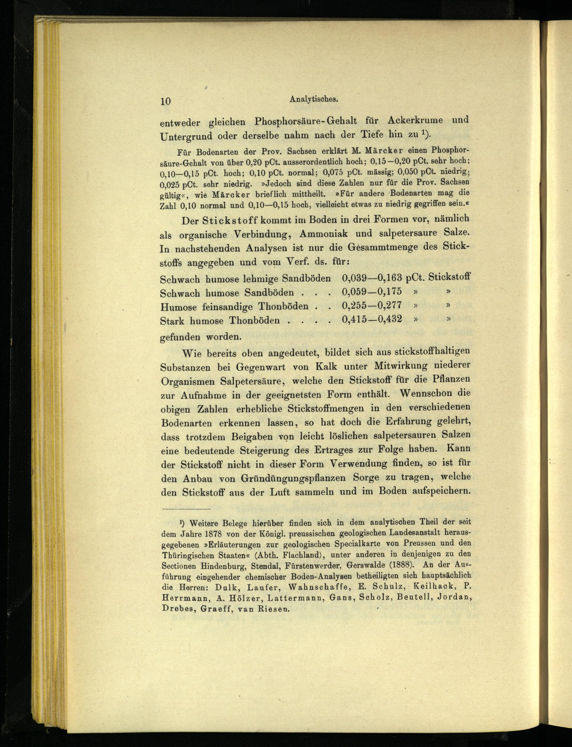 1) Weitere Belege hierüber finden sich in dem analytischen Theil der seit dem Jahre 1878 von der Königl. preussischen geologischen Landesanstalt herausgegebenen»Erläuterungen zur geologischen Specialkarte von Preussen und den Thüringischen Staaten«(Abth. Flachland), unter anderen in denjenigen zu den Seetionen Hindenburg, Stendal, Fürstenwerder, Gerswalde(1888). An der Ausführung eingehender chemischer Boden-Analysen betheiligten sich hauptsächlich die Herren: Dulk, Laufer, Wahnschaffe, E. Schulz, Keilhack, P. Herrmann, A. Hölzer, Lattermann, Gans, Scholz, Beutell, Jordan, Drebes, Graeff, van Riesen..