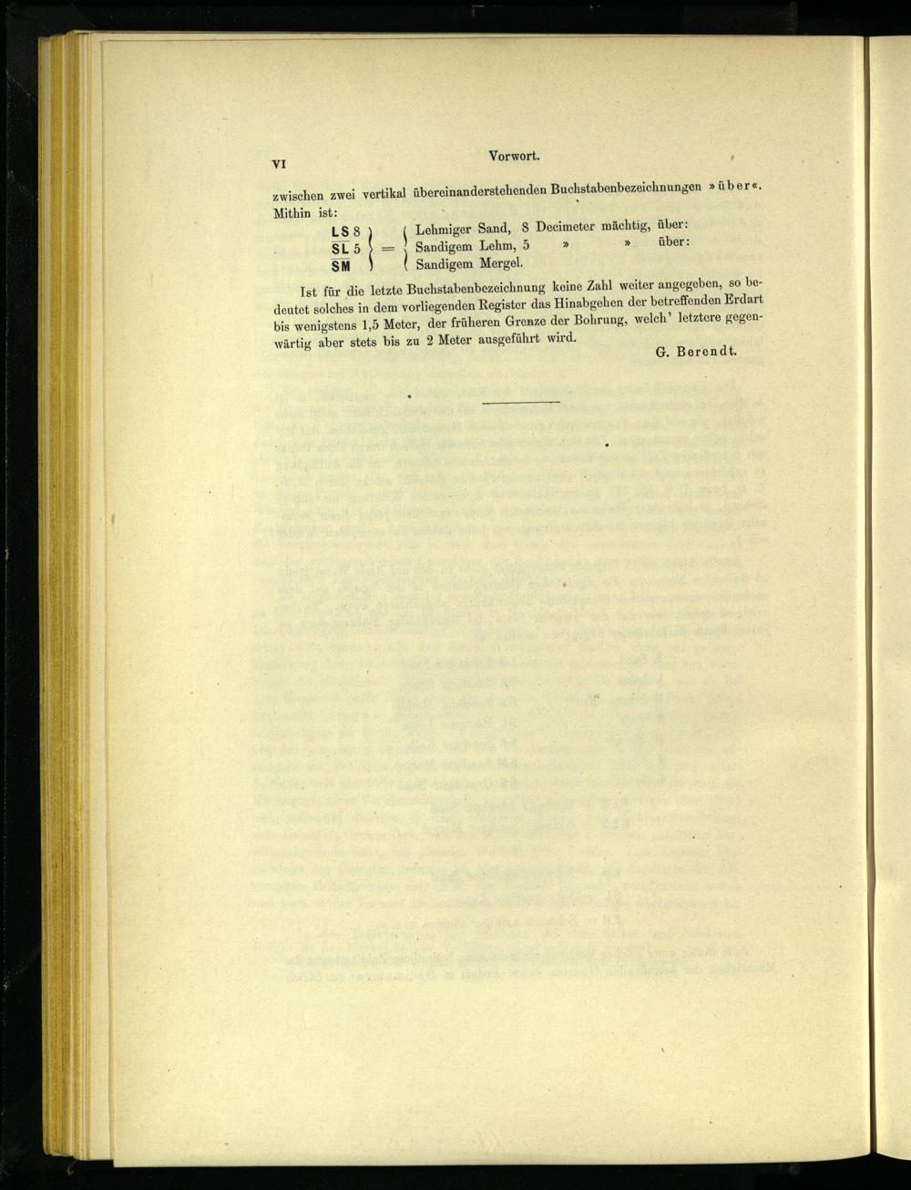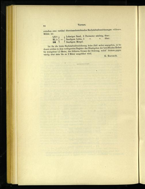 SM Ist für die letzte Buchstabenbezeichnung keine Zahl weiter angegeben, so bedeutet solches in dem vorliegenden Register das Hinabgehen der betreffenden Erdart bis wenigstens 1,5 Meter, der früheren Grenze der Bohrung, welch” letztere gegenwärtig aber stets bis zu 2 Meter ausgeführt wird. G. Berendt.