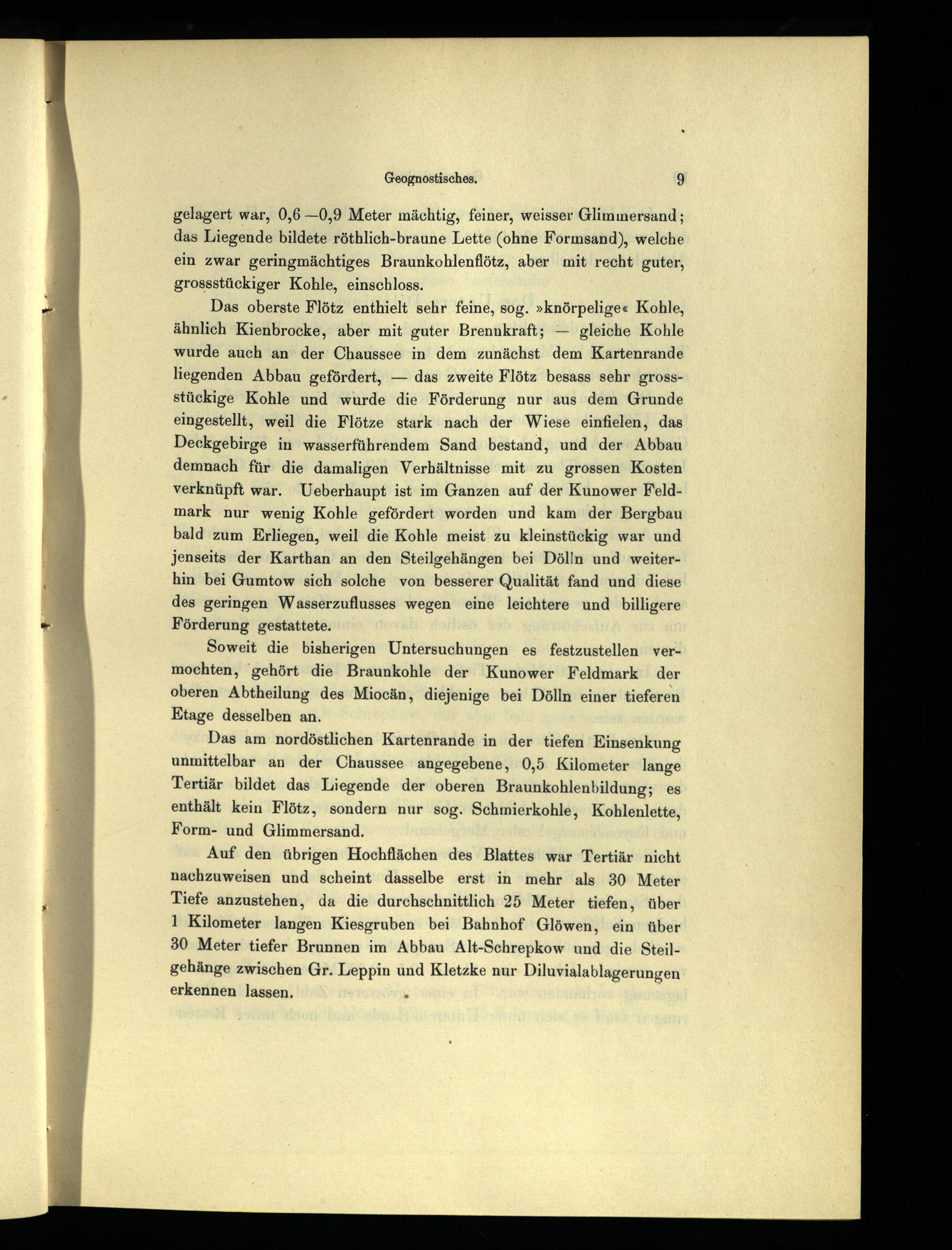 Soweit die bisherigen Untersuchungen es festzustellen vermochten, gehört die Braunkohle der Kunower Feldmark der oberen Abtheilung des Miocän, diejenige bei Dölln einer tieferen Etage desselben an.