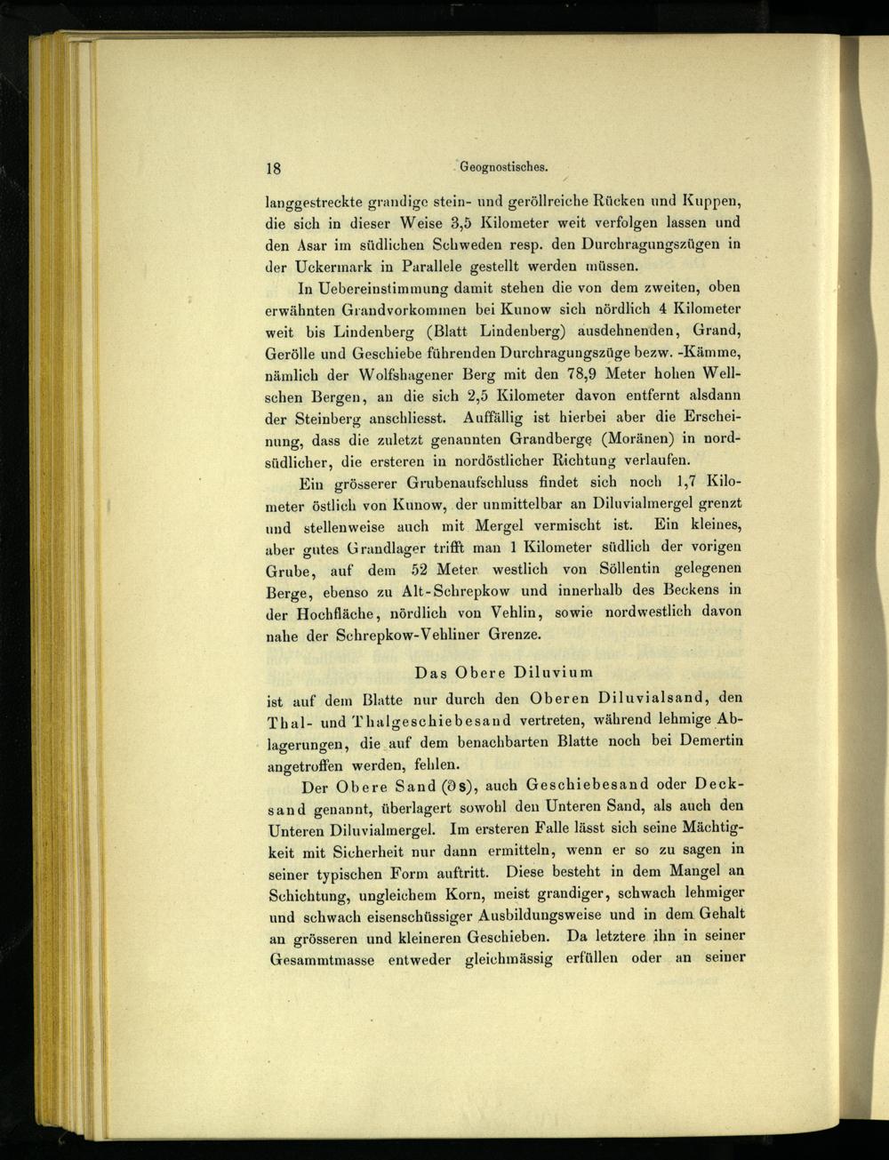 Der Obere Sand(ds), auch Geschiebesand oder Decksand genannt, überlagert sowohl den Unteren Sand, als auch den Unteren Diluvialmergel. Im ersteren Falle lässt sich seine Mächtigkeit mit Sicherheit nur dann ermitteln, wenn er so zu sagen in seiner typischen Form auftritt. Diese besteht in dem Mangel an Schichtung, ungleichem Korn, meist grandiger, schwach lehmiger und schwach eisenschüssiger Ausbildungsweise und in dem. Gehalt an grösseren und kleineren Geschieben. Da letztere ihn in seiner Gesammtmasse entweder gleichmässig erfüllen oder an seiner