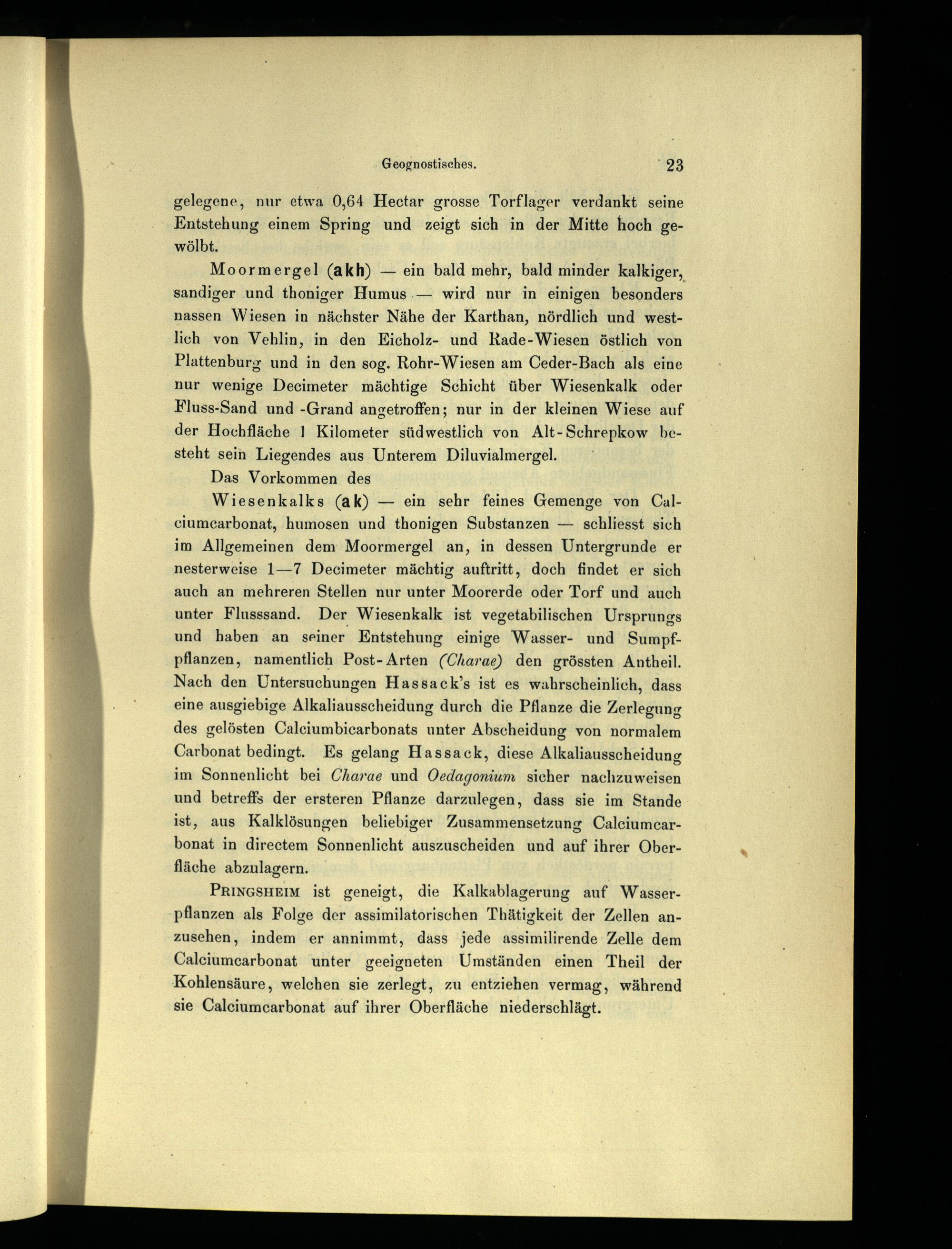 Wiesenkalks(ak)— ein sehr feines Gemenge von Calciumcarbonat, humosen und thonigen Substanzen— schliesst sich im Allgemeinen dem Moormergel an, in dessen Untergrunde er nesterweise 1—7 Decimeter mächtig auftritt, doch findet er sich auch an mehreren Stellen nur unter Moorerde oder Torf und auch unter Flusssand. Der Wiesenkalk ist vegetabilischen Ursprungs und haben an seiner Entstehung einige Wasser- und Sumpfpflanzen, namentlich Post- Arten(Charae) den grössten Antheil. Nach den Untersuchungen Hassack’s ist es wahrscheinlich, dass eine ausgiebige Alkaliausscheidung durch die Pflanze die Zerlegung des gelösten Calciumbicarbonats unter Abscheidung von normalem Carbonat bedingt. Es gelang Hassack, diese Alkaliausscheidung im Sonnenlicht bei Charae und Oedagonium sicher nachzuweisen und betreffs der ersteren Pflanze darzulegen, dass sie im Stande ist, aus Kalklösungen beliebiger Zusammensetzung Calciumecarbonat in directem Sonnenlicht auszuscheiden und auf ihrer Oberfläche abzulagern.
