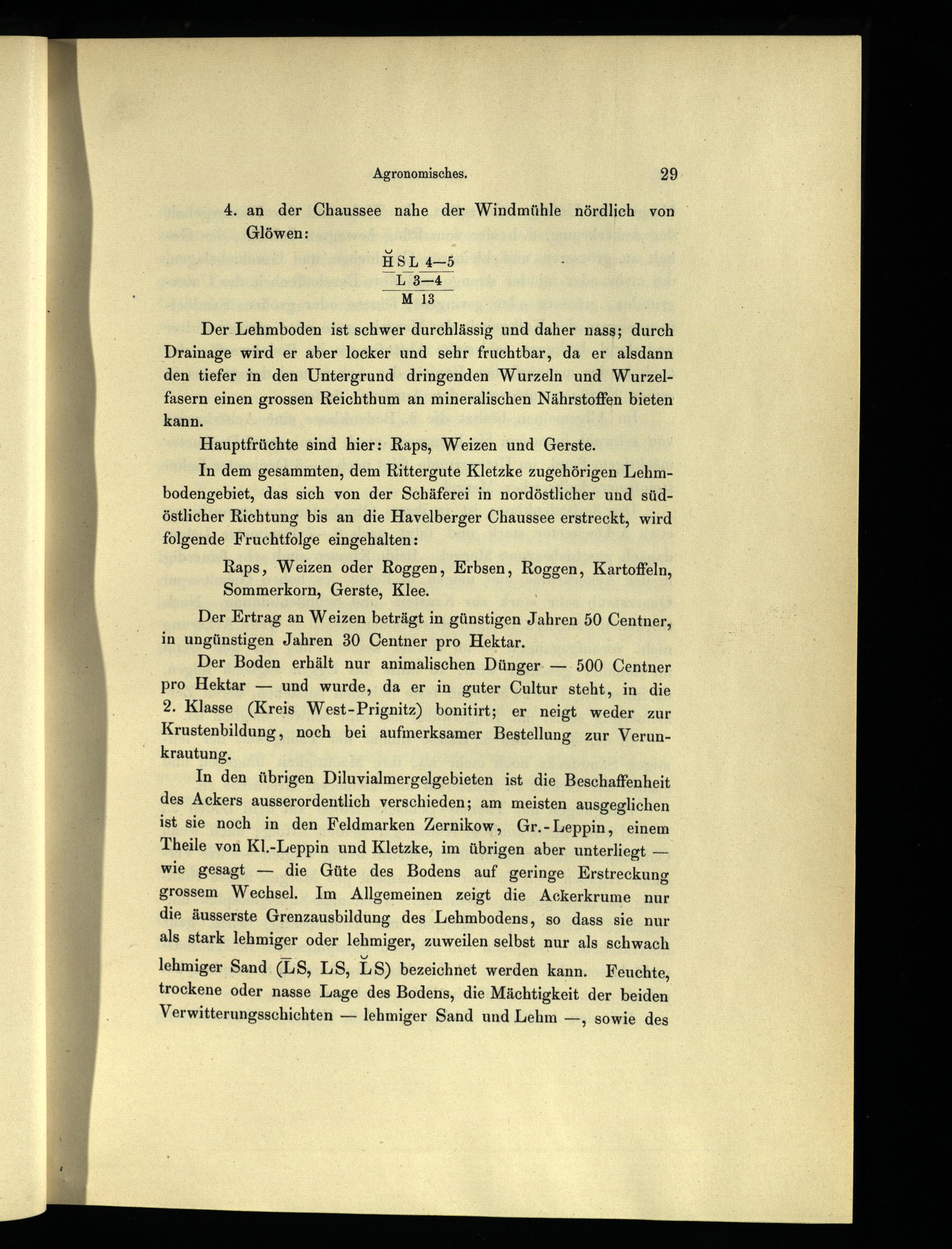 In den übrigen Diluvialmergelgebieten ist die Beschaffenheit des Ackers ausserordentlich verschieden; am meisten ausgeglichen ist sie noch in den Feldmarken Zernikow, Gr.-Leppin, einem Theile von Kl.-Leppin und Kletzke, im übrigen aber unterliegt— wie gesagt— die Güte des Bodens auf geringe Erstreckung grossem Wechsel. Im Allgemeinen zeigt die Ackerkrume nur die äusserste Grenzausbildung des Lehmbodens, so dass sie nur als stark lehmiger oder lehmiger, zuweilen selbst nur als schwach lehmiger Sand(LS, LS, LS) bezeichnet werden kann. Feuchte, trockene oder nasse Lage des Bodens, die Mächtigkeit der beiden Verwitterungsschichten— lehmiger Sand und Lehm—, sowie des