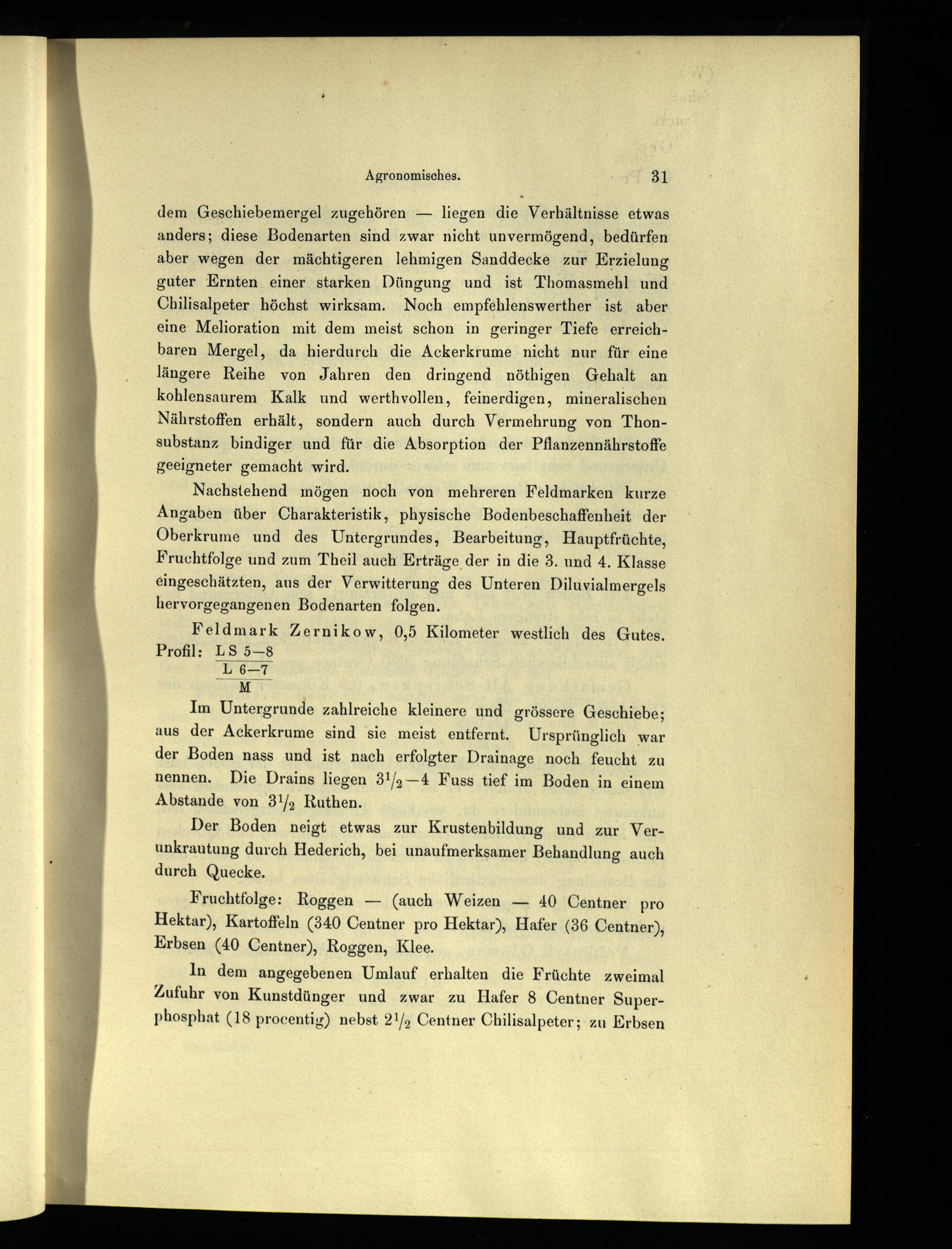 Im Untergrunde zahlreiche kleinere und grössere Geschiebe; aus der Ackerkrume sind sie meist entfernt. Ursprünglich war der Boden nass und ist nach erfolgter Drainage noch feucht zu nennen. Die Drains liegen 3!/2—4 Fuss tief im Boden in einem Abstande von 31/2 Ruthen.