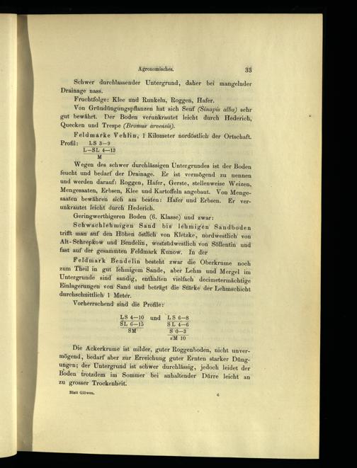 Die Ackerkrume ist milder, guter Roggenboden, nicht unvermögend, bedarf aber zur Erreichung guter Ernten starker Düngungen; der Untergrund ist‘ schwer durchlässig, jedoch leidet der Boden‘ trotzdem‘ im‘ Sommer‘ Bei anhaltender Dürre leicht an zu grosser Trockenheit.