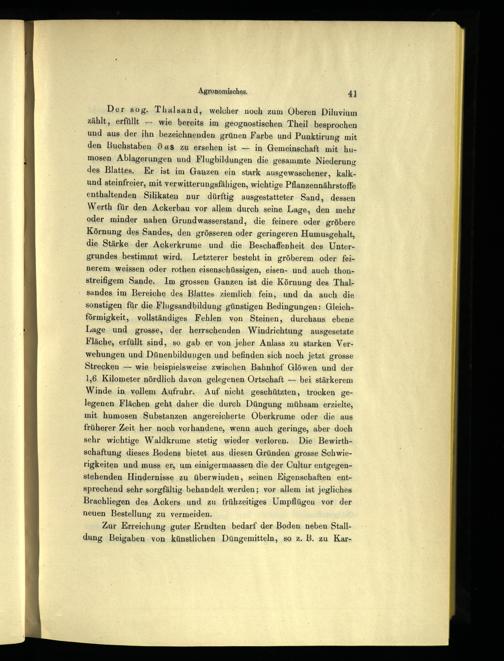 Der sog. Thalsand, welcher noch zum Oberen Diluvium zählt, erfüllt— wie bereits im geognostischen Theil besprochen und aus der ihn bezeichnenden grünen Farbe und Punktirung mit den Buchstaben das zu ersehen ist— in Gemeinschaft mit humosen Ablagerungen und Flugbildungen die gesammte Niederung des Blattes, Er ist im Ganzen. ein: stark ausgewaschener, kalkund steinfreier, mit verwitterungsfähigen, wichtige Pflanzennährstoffe enthaltenden, Silikaten nur dürftig ausgestatteter Sand, dessen Werth für den Ackerbau vor allem durch seine Lage, den mehr oder minder nahen Grundwasserstand, die feinere oder gröbere Körnung des Sandes, den grösseren oder geringeren Humusgehalt, die Stärke. der Ackerkrume und die Beschaffenheit des Untergrundes bestimmt wird. Letzterer besteht in gröberem oder feinerem, weissen oder rothen eisenschüssigen, eisen- und auch thonstreifigem Sande. Im grossen Ganzen ist die Körnung des Thal; sandes im Bereiche des Blattes ziemlich fein; und da auch die sonstigen für die Flugsandbildung günstigen Bedingungen: Gleichförmigkeit, vollständiges Fehlen von Steinen, durchaus ebene Lage, und grosse, der herrschenden Windrichtung ausgesetzte Fläche, erfüllt sind, so gab er von jeher Anlass zu starken Verwehungen und Dünenbildungen und befinden sich noch jetzt grosse Strecken— wie beispielsweise zwischen Bahnhof Glöwen und der 1,6 Kilometer nördlich davon gelegenen Ortschaft— bei stärkerem Winde. in, vollem Aufruhr. Auf nicht geschützten, trocken gelegenen Flächen geht daher die durch Düngung mühsam erzielte, mit humosen Substanzen angereicherte Oberkrume oder die aus früherer Zeit her noch vorhandene, wenn auch geringe, aber doch sehr wichtige Waldkrume stetig wieder verloren. Die Bewirthschaftung dieses Bodens bietet aus diesen Gründen grosse Schwierigkeiten und muss er, um einigermaassen, die der Cultur entgegenstehenden Hindernisse zu überwinden, seinen Eigenschaften entsprechend sehr sorgfältig. behandelt werden; vor allem ist jegliches Brachliegen des Ackers und zu frühzeitiges Umpflügen vor der neuen Bestellung zu vermeiden.