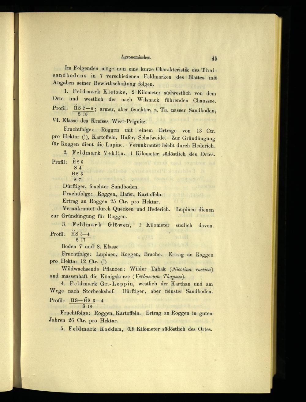 Profil: HS—-HS 3—4 Fruchtfolge: Roggen, Kartoffeln. Ertrag an Roggen in guten Jahren 26 Ctr. pro Hektar.