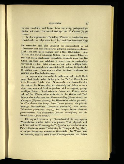 Im sogenannten»Raume-Luch« trifft man nach 14—19 Decimeter Torf Sand; weiter östlich geht der Torf in Moorerde von 2—5 Decimeter Stärke über. Wiesennarbe und Rasensohle sind hier mürbe, die Wiesen aber nur einschürig und liefern— wenn nicht compostirt und Sand aufgefahren wird— mageres, geringwerthiges Futter. Charakteristische Gräser und Kräuter stellen sich auf den Wiesen selbst nicht ein, in den Gräben und Torflöchern aber findet man den Wasserschierling(Cicuta virosa), das Mannagras(GIyceria fluitans), den Wiesensalbei(Salvia pratensis); im»Post-Luch« den Sumpf-Porst(Ledum palustre), die pfirsichblättrige Glockenblume(Campanula persicifolia), den grossen Hahnenfuss(Ranunculus lingua), den Lungen- Enzian(Gentiana Preumonanthe), den Sonnenthau(Drosera rotundifolia) und die Sumpf-Heide(Erica tetralix).
