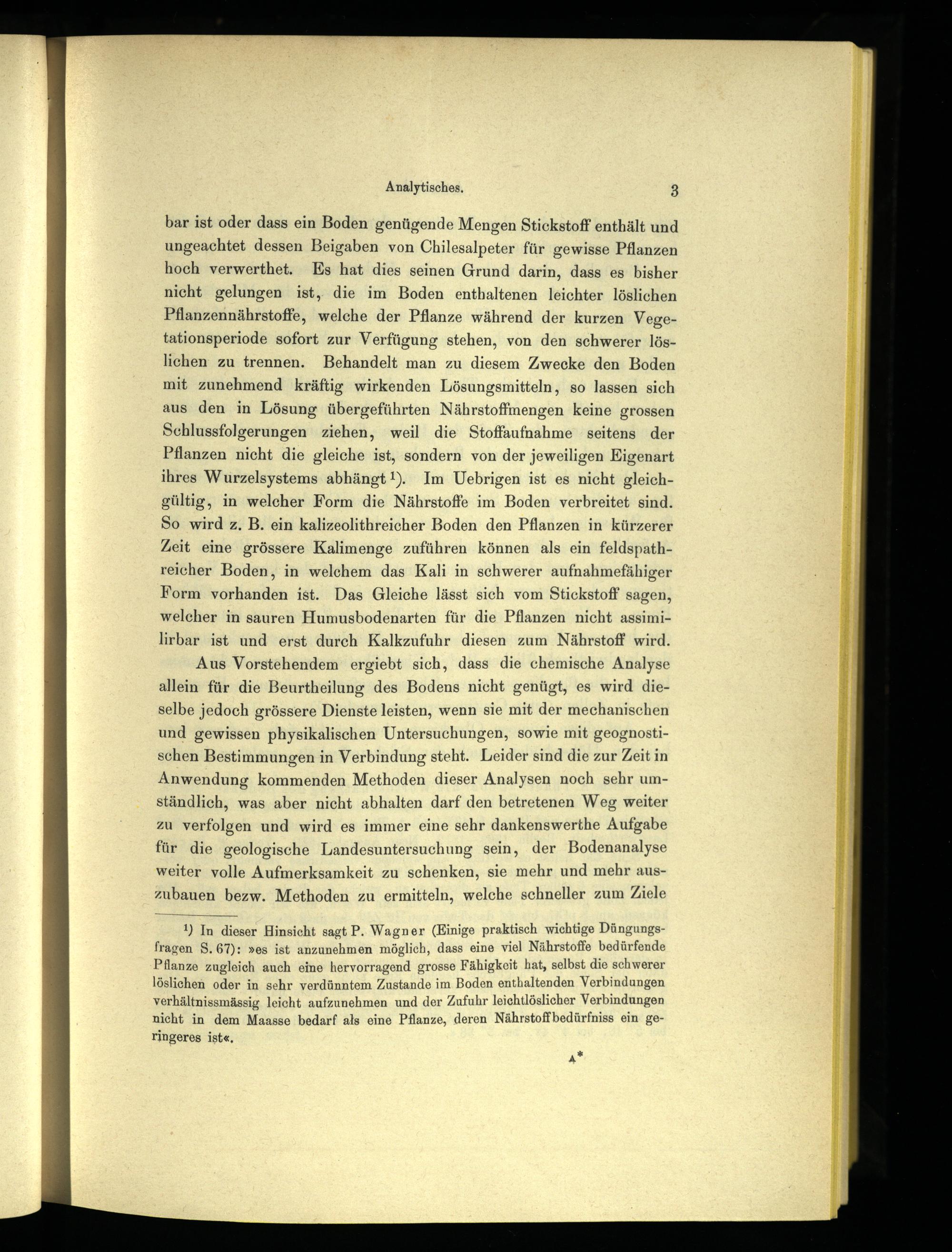 bar ist oder dass ein Boden genügende Mengen Stickstoff enthält und ungeachtet dessen Beigaben von Chilesalpeter für gewisse Pflanzen hoch verwerthet. Es hat dies seinen Grund darin, dass es bisher nicht gelungen ist, die im Boden enthaltenen leichter löslichen Pflanzennährstoffe, welche der Pflanze während der kurzen Vegetationsperiode sofort zur Verfügung stehen, von den schwerer löslichen zu trennen. Behandelt man zu diesem Zwecke den Boden mit zunehmend kräftig wirkenden Lösungsmitteln, so lassen sich aus den in Lösung übergeführten Nährstoffmengen keine grossen Schlussfolgerungen ziehen, weil die Stoffaufnahme seitens der Pflanzen nicht die gleiche ist, sondern von der jeweiligen Eigenart ihres Wurzelsystems abhängt!). Im Uebrigen ist es nicht gleichgültig, in welcher Form die Nährstoffe im Boden verbreitet sind. So wird z, B. ein kalizeolithreicher Boden den Pflanzen in kürzerer Zeit eine grössere Kalimenge zuführen können als ein feldspathreicher Boden, in welchem das Kali in schwerer aufnahmefähiger Form vorhanden ist. Das Gleiche lässt sich vom Stickstoff sagen, welcher in sauren Humusbodenarten für die Pflanzen nicht assimilirbar ist und erst durch Kalkzufuhr diesen zum Nährstoff wird.