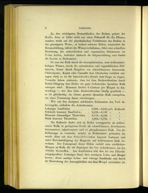 Zu den wichtigsten Bestandtheilen des Bodens gehört ‚der Kalk, denn er bildet nicht nur einen Nährstoff für die Pflanze, sondern‘ wirkt auf die physikalischen Verhältnisse des Bodens in der günstigsten Weise, er lockert schwere Böden, vermindert die Krustenbildung, influirt die Wärmeverhältnisse, führt eine schnellere