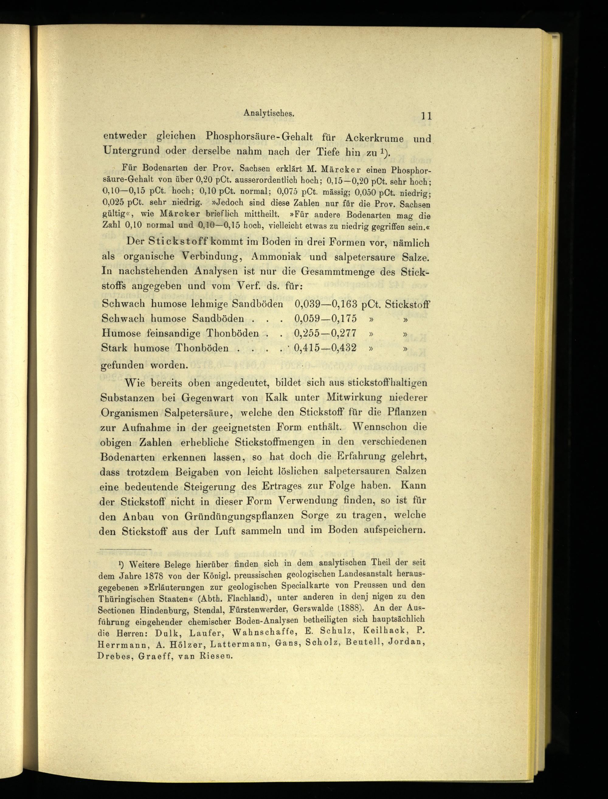 1) Weitere Belege hierüber finden sich in dem analytischen Theil der seit dem Jahre 1878 von der Königl. preussischen geologischen Landesanstalt herausgegebenen»Erläuterungen zur geologischen Specialkarte von Preussen und den Thüringischen Staaten«(Abth. Flachland), unter anderen in denj nigen zu den Sectionen Hindenburg, Stendal, Fürstenwerder, Gerswalde(1888). An der Ausführung eingehender chemischer Boden-Analysen betheiligten sich hauptsächlich die Herren: Dulk, Laufer, Wahnschaffe, E. Schulz, Keilhack, P. Herrmann, A. Hölzer, Lattermann, Gans, Scholz, Beutell, Jordan, Drebes, Graeff, van Riesen.