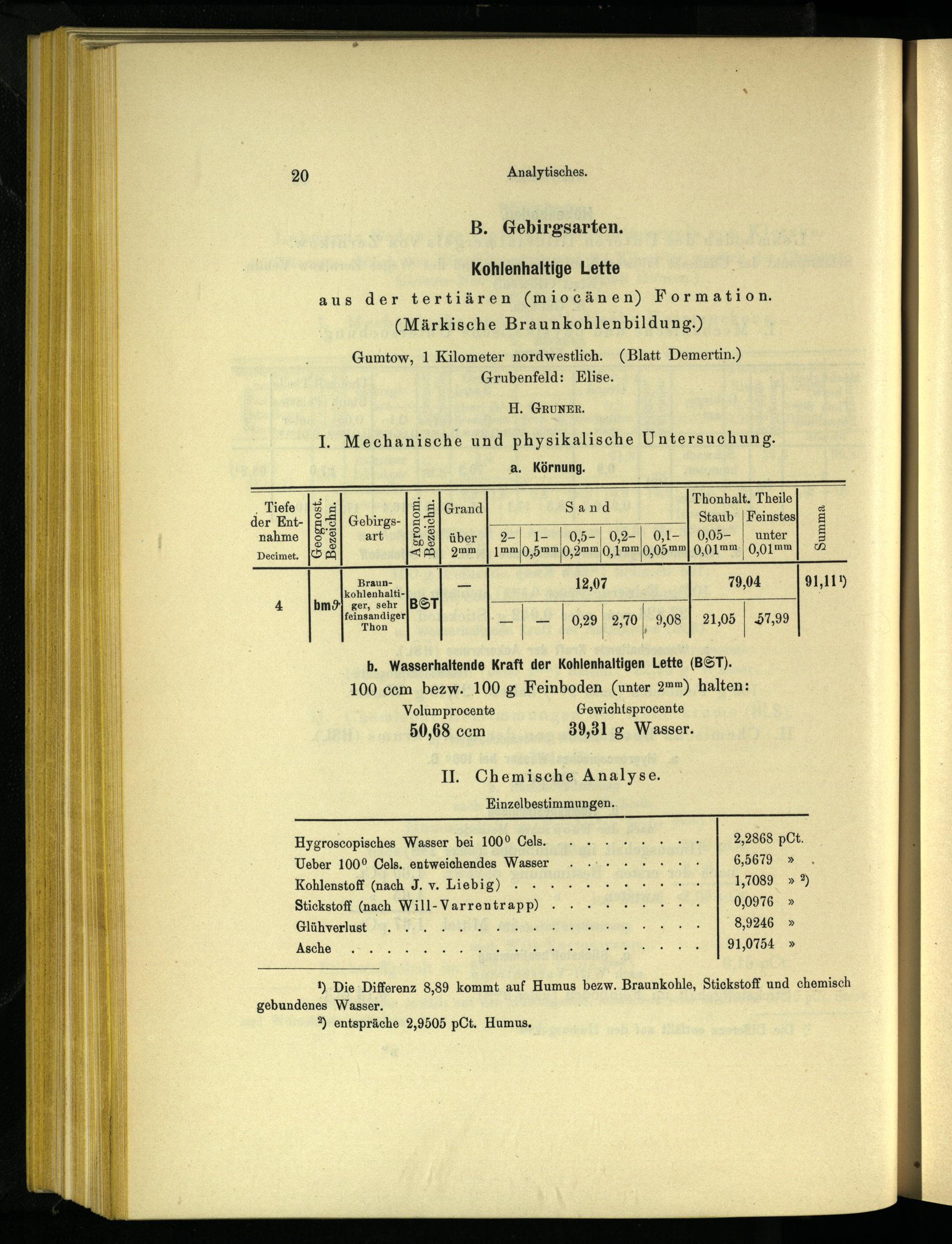 1) Die Differenz 8,89 kommt auf Humus bezw. Braunkohle, Stickstoff und chemisch gebundenes Wasser.