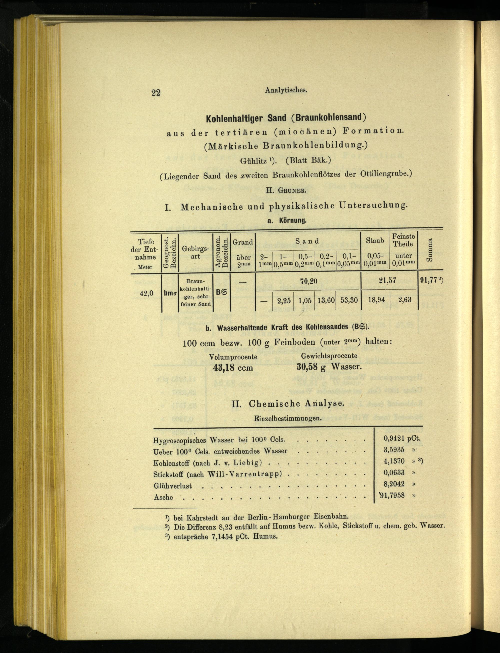 1) bei Kahrstedt an der Berlin- Hamburger Eisenbahn. 2) Die Differenz 8,23 entfällt auf Humus bezw. Kohle, Stickstoff u. chem. geb. Wasser, 3) entspräche 7,1454 pCt. Humus.