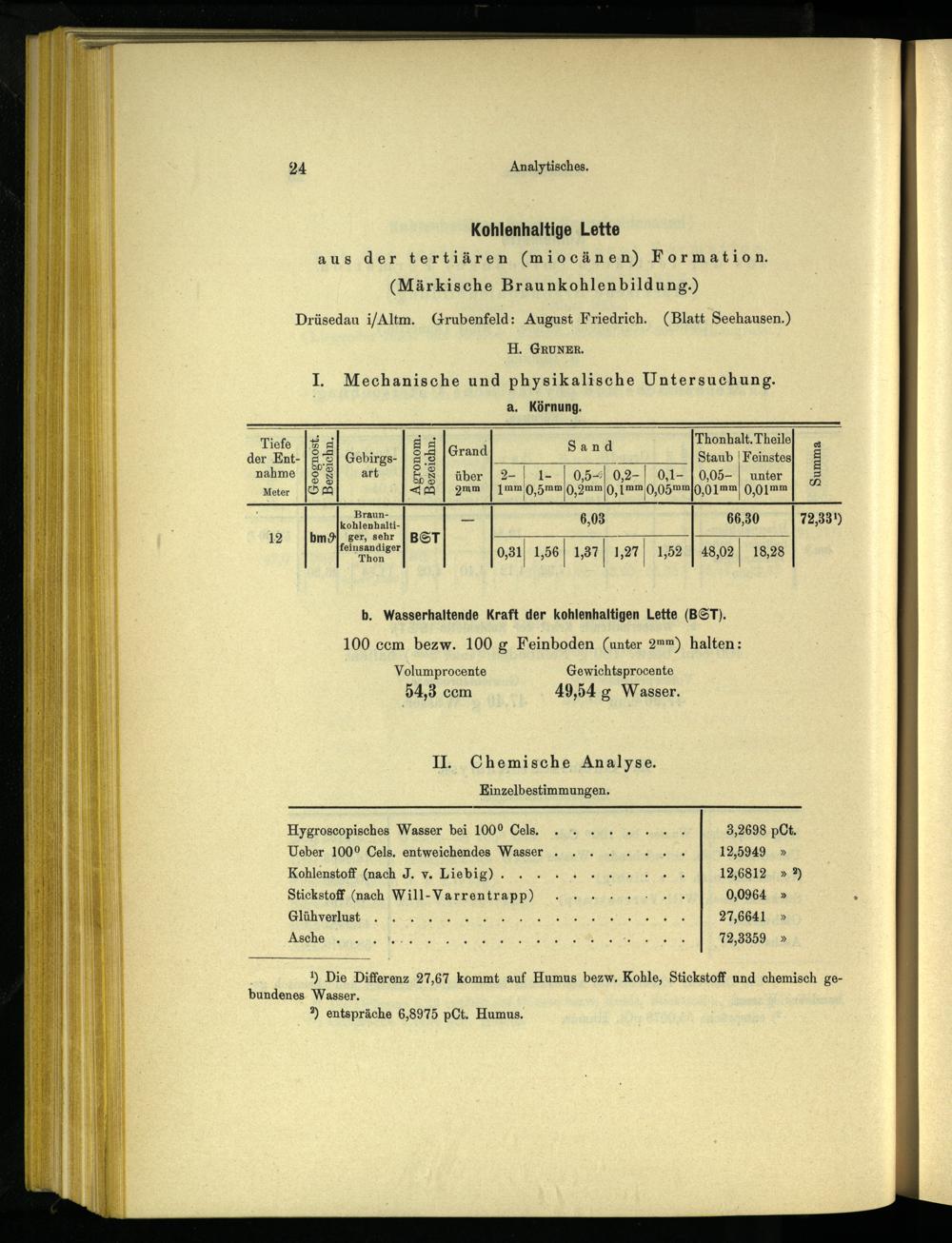 1) Die Differenz 27,67 kommt auf Humus bezw. Kohle, Stickstoff und chemisch gebundenes Wasser. ?) entspräche 6,8975 pCt. Humus.