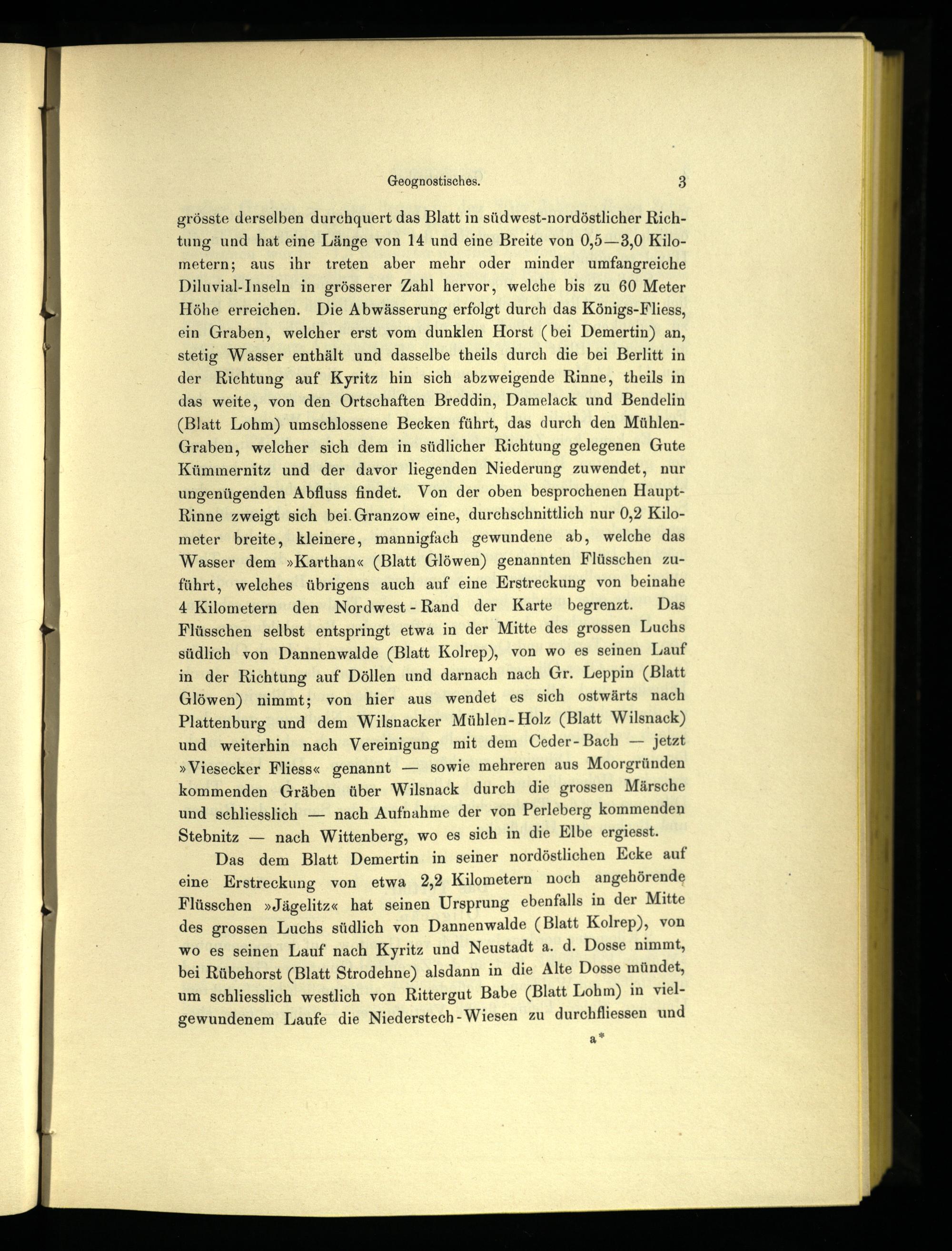 grösste derselben durchquert das Blatt in südwest-nordöstlicher Richtung und hat eine Länge von 14 und eine Breite von 0,5—3,0 Kilometern; aus ihr treten aber mehr oder minder umfangreiche Diluvial-Inseln in grösserer Zahl hervor, welche bis zu 60 Meter Höhe erreichen. Die Abwässerung erfolgt durch das Königs-Fliess, ein Graben, welcher erst vom dunklen Horst(bei Demertin) an, stetig Wasser enthält und dasselbe theils durch die bei Berlitt in der Richtung auf Kyritz hin sich abzweigende Rinne, theils in das weite, von den Ortschaften Breddin, Damelack und Bendelin (Blatt Lohm) umschlossene Becken führt, das durch den MühlenGraben, welcher sich dem in südlicher Richtung gelegenen Gute Kümmernitz und der davor liegenden Niederung zuwendet, nur ungenügenden Abfluss findet. Von der oben besprochenen HauptRinne zweigt sich bei. Granzow eine, durchschnittlich nur 0,2 Kilometer breite, kleinere, mannigfach gewundene ab, welche das Wasser dem»Karthan«(Blatt Glöwen) genannten Flüsschen zuführt, welches übrigens auch auf eine Erstreckung von beinahe 4 Kilometern den Nordwest- Rand der Karte begrenzt. Das Flüsschen selbst entspringt etwa in der Mitte des grossen Luchs südlich von Dannenwalde(Blatt Kolrep), von wo es seinen Lauf in der Richtung auf Döllen und darnach nach Gr. Leppin(Blatt Glöwen) nimmt; von hier aus wendet es sich ostwärts nach Plattenburg und dem Wilsnacker Mühlen- Holz(Blatt Wilsnack) und weiterhin nach Vereinigung mit dem Ceder- Bach— jetzt »Viesecker Fliess« genannt— sowie mehreren aus Moorgründen kommenden Gräben über Wilsnack durch die grossen Märsche und schliesslich— nach Aufnahme der von Perleberg kommenden Stebnitz— nach Wittenberg, wo es sich in die Elbe ergiesst. Das dem Blatt Demertin in seiner nordöstlichen Ecke auf eine Erstreckung von etwa 2,2 Kilometern noch angehörende Flüsschen»Jägelitz« hat seinen Ursprung ebenfalls in der Mitte des grossen Luchs südlich von Dannenwalde(Blatt Kolrep), von wo es seinen Lauf nach Kyritz und Neustadt a. d. Dosse nimmt, bei Rübehorst(Blatt Strodehne) alsdann in die Alte Dosse mündet, um schliesslich westlich von Rittergut Babe(Blatt Lohm) in vielgewundenem Laufe die Niederstech- Wiesen zu durchfliessen und
