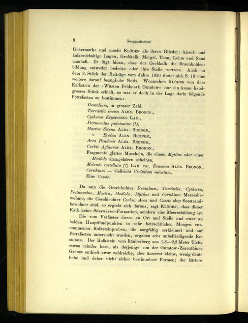 Da nun die Geschlechter Dentalium» Turritella, Cytherea, Pectunculus, Mactra, Modiola, Mytilus und Cerithium Meeresbewohner, die Geschlechter Corbis, Arca und Cassis aber Seestrandbewohner sind, so ergiebt sich daraus, sagt KLÖDEN, dass dieser Kalk keine Süsswasser-Formation, sondern eine Meeresbildung ist.