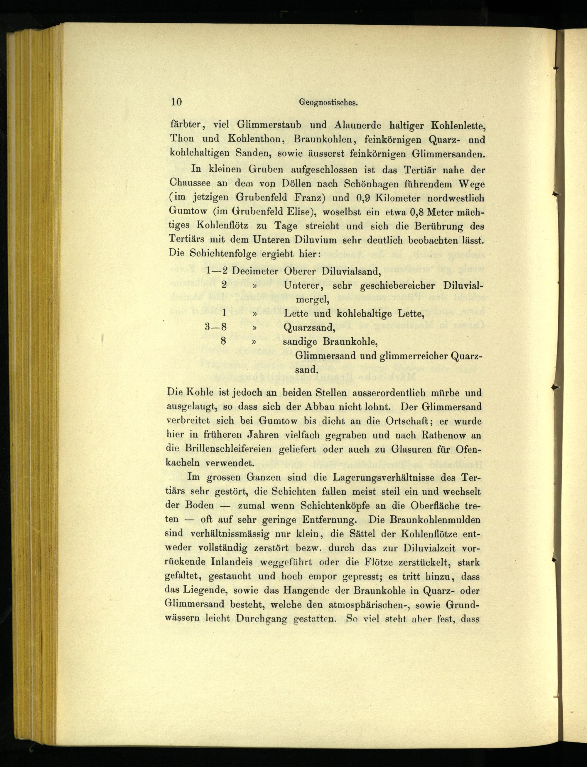 färbter, viel Glimmerstaub und Alaunerde haltiger Kohlenlette, Thon und Kohlenthon, Braunkohlen, feinkörnigen Quarz- und kohlehaltigen Sanden, sowie äusserst feinkörnigen Glimmersanden. In kleinen Gruben aufgeschlossen ist das Tertiär nahe der Chaussee an dem von Döllen nach Schönhagen führendem Wege (im jetzigen Grubenfeld Franz) und 0,9 Kilometer nordwestlich Gumtow(im Grubenfeld Elise), woselbst ein etwa 0,8 Meter mächtiges Kohlenflötz zu Tage streicht und sich die Berührung des Tertiärs mit dem Unteren Diluvium sehr deutlich beobachten lässt. Die Schichtenfolge ergiebt hier: 1—2 Decimeter Oberer Diluvialsand, 2 Unterer, sehr geschiebereicher Diluvialmergel, Lette und kohlehaltige Lette, Quarzsand, sandige Braunkohle, Glimmersand und glimmerreicher Quarzsand,