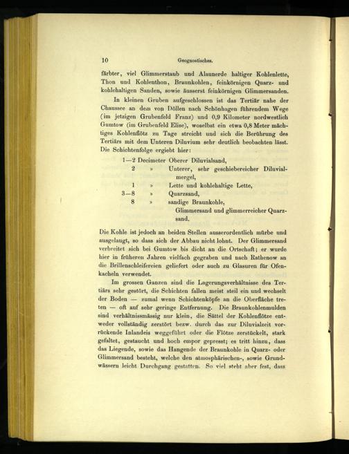 Die Kohle ist jedoch an beiden Stellen ausserordentlich mürbe und ausgelaugt, so dass sich der Abbau nicht lohnt. Der Glimmersand verbreitet sich bei Gumtow bis dicht an die Ortschaft; er wurde hier in früheren Jahren vielfach gegraben und nach Rathenow an die Brillenschleifereien geliefert oder auch zu Glasuren für Ofenkacheln verwendet.; Im grossen Ganzen sind die Lagerungsverhältnisse des Tertiärs sehr gestört, die Schichten fallen meist steil ein und wechselt der Boden— zumal wenn Schichtenköpfe an die Oberfläche treten— oft auf sehr geringe Entfernung. Die Braunkohlenmulden sind verhältnissmässig nur klein, die Sättel der Kohlenflötze entweder vollständig zerstört bezw. durch das zur Diluvialzeit vorrückende Inlandeis weggeführt oder die Flötze zerstückelt, stark gefaltet, gestaucht und hoch empor gepresst; es tritt hinzu, dass das Liegende, sowie das Hangende der Braunkohle in Quarz- oder Glimmersand besteht, welche den atmosphärischen-, sowie Grundwässern leicht Durchgang gestatten. So viel steht aber fest, dass