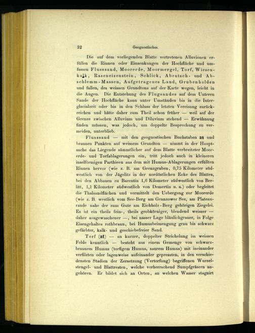 Die auf dem vorliegenden Blatte vertretenen Alluvionen erfüllen die Rinnen oder Einsenkungen der Hochfläche und umfassen Flusssand, Moorerde, Moormergel, Torf, Wiesenkajlk, Raseneisenstein, Schlick, Abrutsch- und Abschlemm-Massen, Aufgetragenes Land, Grubenhalden und fallen, des weissen Grundtons auf der Karte wegen, leicht in die Augen. Die Entstehung des Flugsandes auf dem Unteren Sande der Hochfläche kann unter Umständen bis in die Interglacialzeit oder bis in den Schluss der letzten Vereisung zurückreichen und hätte daher zum Theil schon früher— weil auf der Grenze zwischen Alluvium und Diluvium stehend— Erwähnung finden müssen, was jedoch, um doppelte Besprechung zu vermeiden, unterblieb.