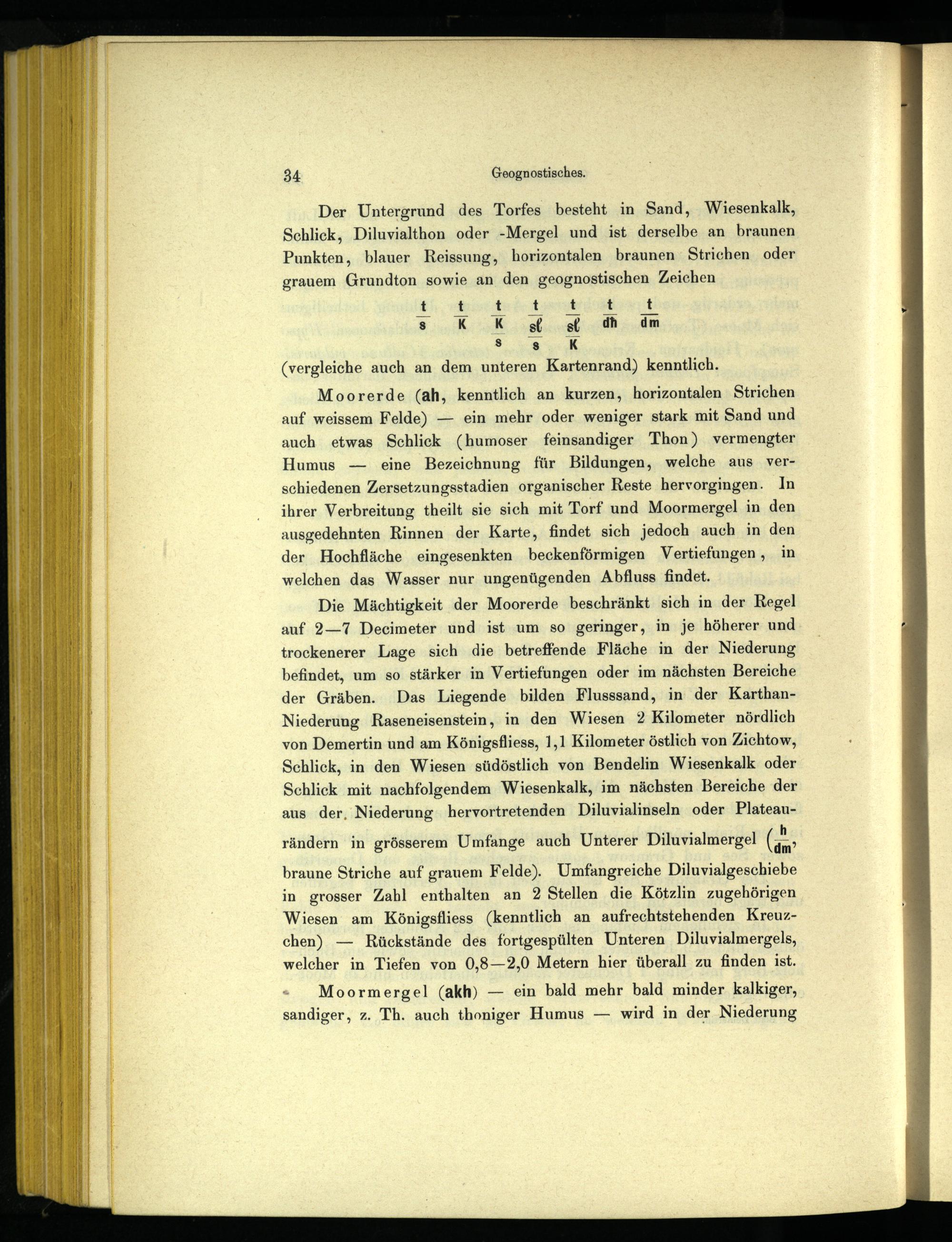 Moorerde(ah, kenntlich an kurzen, horizontalen Strichen auf weissem Felde)— ein mehr oder weniger stark mit Sand und auch etwas Schlick(humoser feinsandiger Thon) vermengter Humus— eine Bezeichnung für Bildungen, welche aus verschiedenen Zersetzungsstadien organischer Reste hervorgingen. In ihrer Verbreitung theilt sie sich mit Torf und Moormergel in den ausgedehnten Rinnen der Karte, findet sich jedoch auch in den der Hochfläche eingesenkten beckenförmigen Vertiefungen, in welchen das Wasser nur ungenügenden Abfluss findet.