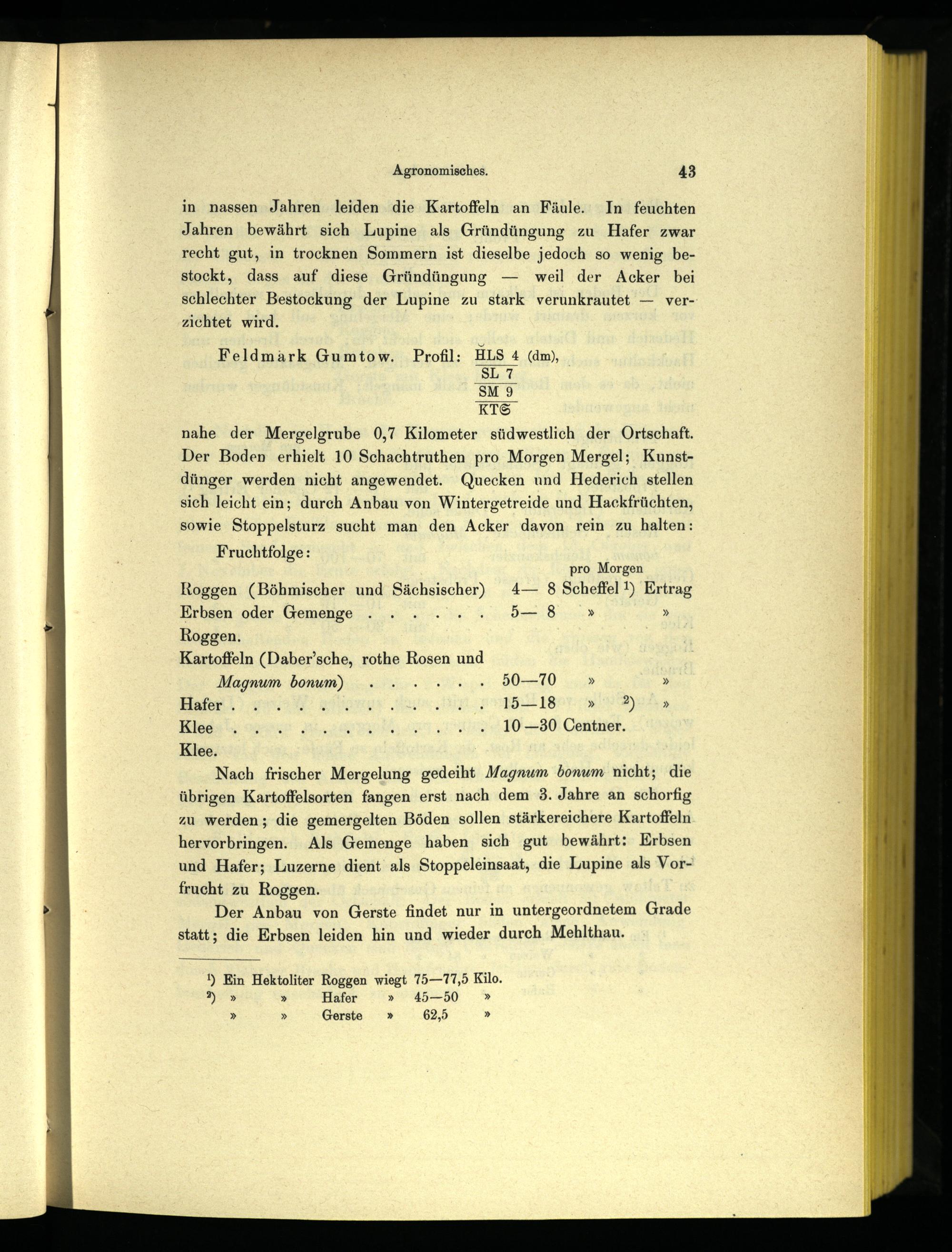 Nach frischer Mergelung gedeiht Magnum bonum nicht; die übrigen Kartoffelsorten fangen erst nach dem 3. Jahre an schorfig zu werden; die gemergelten Böden sollen stärkereichere Kartoffeln hervorbringen. Als Gemenge haben sich gut bewährt: Erbsen und Hafer; Luzerne dient als Stoppeleinsaat, die Lupine als Vorfrucht zu Roggen.