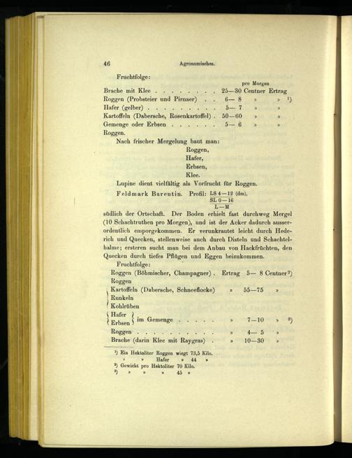Fruchtfolge: pro Morgen Brache mit Klee... 25—30 Centner Ertrag Roggen(Probsteier ind"Pirumer)„u G— 8»» Hafer(gelber)... d— 7» Kartoffeln(Dabersche, Resenkartoflel).. 50—60» Gemenge oder Erbsen...... 5—6» Roggen. Nach frischer Mergelung baut man: Roggen, Hafer, Erbsen, Klee. Lupine dient vielfältig als Vorfrucht für Roggen. Feldmark Barentin. Profil: LS 4—12(dm), SL 0—16 LM südlich der Ortschaft. Der Boden erhielt fast durchweg Mergel (10 Schachtruthen pro Morgen), und ist der Acker dadurch ausserordentlich emporgekommen. Er verunkrautet leicht durch Hederich und Quecken, stellenweise auch durch Disteln und Schachtelhalme; ersteren sucht man bei dem Anbau von Hackfrüchten, den Quecken durch tiefes Pflügen und Eggen beizukommen. Fruchtfolge: Roggen(Böhmischer, Champagner). Ertrag 5— 8 Centner?) Roggen Kartoffeln(Dabersche, Schneeflocke)» 55—75 ) Runkeln | Kohlrüben