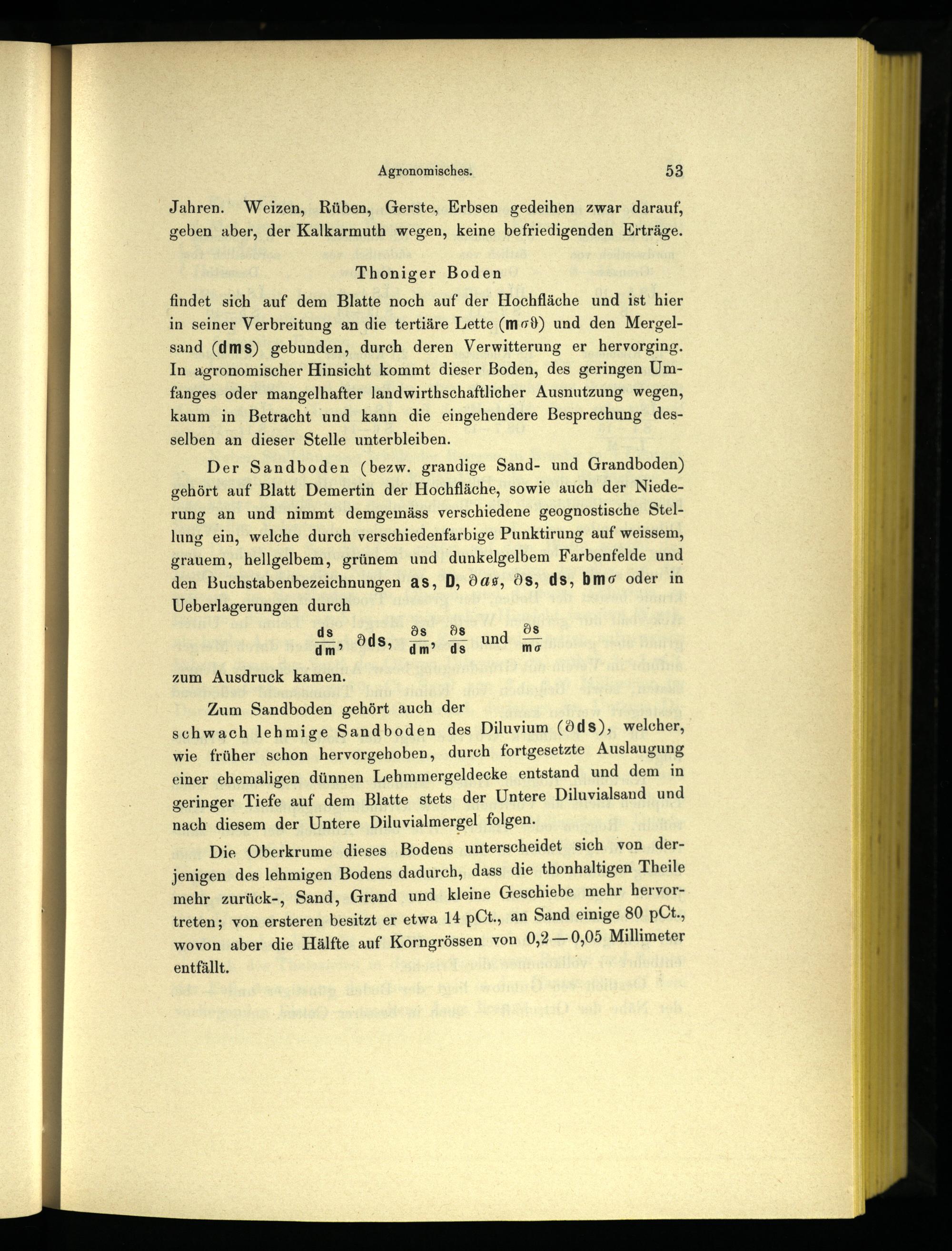 Zum Sandboden gehört auch der schwach lehmige Sandboden des Diluvium(dds), welcher, wie früher sehon hervorgehoben, durch fortgesetzte Auslaugung einer ehemaligen dünnen Lehmmergeldecke entstand und dem in geringer Tiefe auf dem Blatte stets der Untere Diluvialsand und nach diesem der Untere Diluvialmergel folgen.