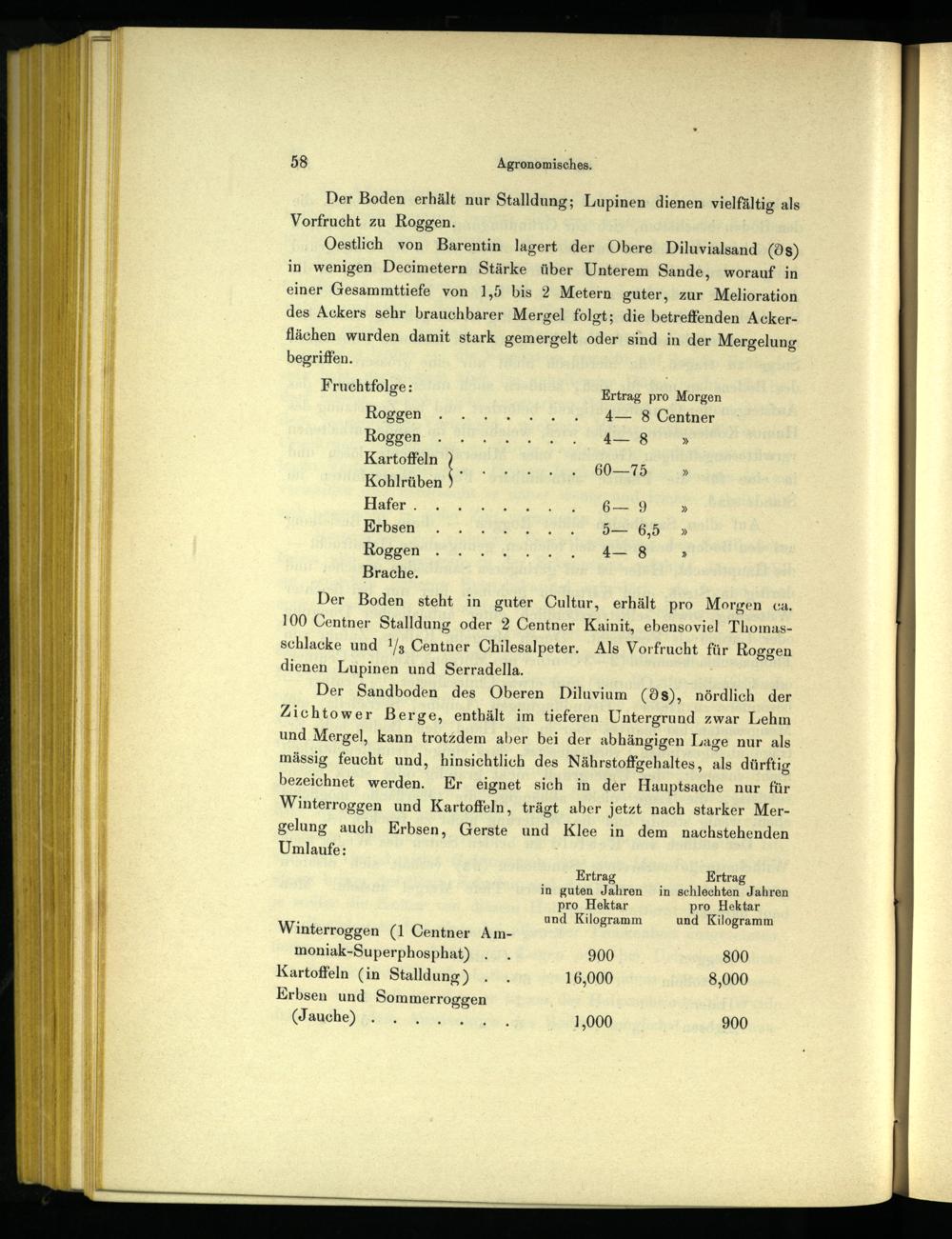 Der Boden steht in guter Cultur, erhält pro Morgen ca. 100 Centner Stalldung oder 2 Centner Kainit, ebensoviel Thomasschlacke und!/3 Centner Chilesalpeter. Als Vorfrucht für Roggen dienen Lupinen und Serradella.