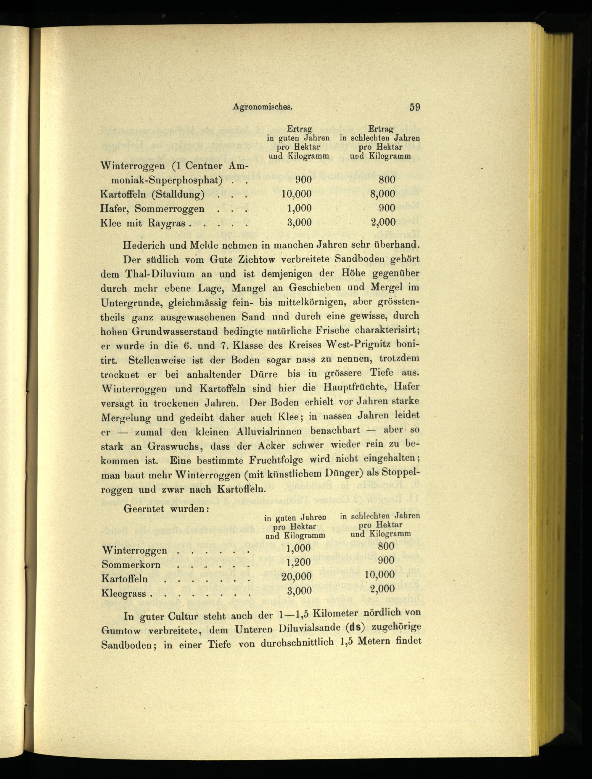 Der südlich vom Gute Zichtow verbreitete Sandboden gehört dem Thal-Diluvium an und ist demjenigen der Höhe gegenüber durch mehr ebene Lage, Mangel an Geschieben und Mergel im Untergrunde, gleichmässig fein- bis mittelkörnigen, aber grösstentheils ganz ausgewaschenen Sand und durch eine gewisse, durch hohen Grundwasserstand bedingte natürliche Frische charakterisirt; er wurde in die 6. und 7. Klasse des Kreises West-Prignitz bonitirt. Stellenweise ist der Boden sogar nass zu nennen, trotzdem trocknet er bei anhaltender Dürre bis in grössere Tiefe aus. Winterroggen und Kartoffeln sind hier die Hauptfrüchte, Hafer versagt in trockenen Jahren. Der Boden erhielt vor Jahren starke Mergelung und gedeiht daher auch Klee; in nassen Jahren leidet er— zumal den kleinen Alluvialrinnen benachbart— aber so stark an Graswuchs, dass der Acker schwer wieder rein zu bekommen ist. Eine bestimmte Fruchtfolge wird nicht eingehalten; man baut mehr Winterroggen(mit künstlichem Dünger) als Stoppelroggen und zwar nach Kartoffeln.