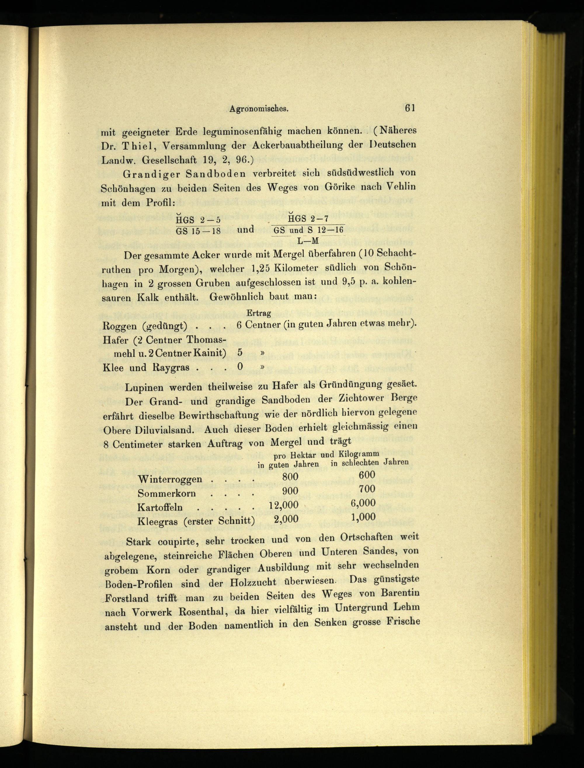 Der gesammte Acker wurde mit Mergel überfahren(10 Schachtruthen pro Morgen), welcher 1,25 Kilometer südlich von Schönhagen in 2 grossen Gruben aufgeschlossen ist und 9,5 p. a. kohlensauren Kalk enthält. Gewöhnlich baut man: