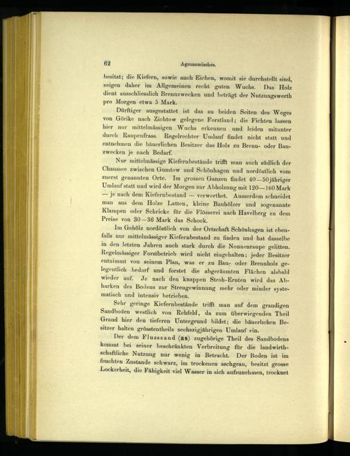 besitzt; die Kiefern, sowie auch Eichen, womit sie durchstellt sind, zeigen daher im Allgemeinen recht guten Wuchs. Das Holz dient ausschliesslich Brennzwecken und beträgt der Nutzungswerth pro Morgen etwa 5 Mark.