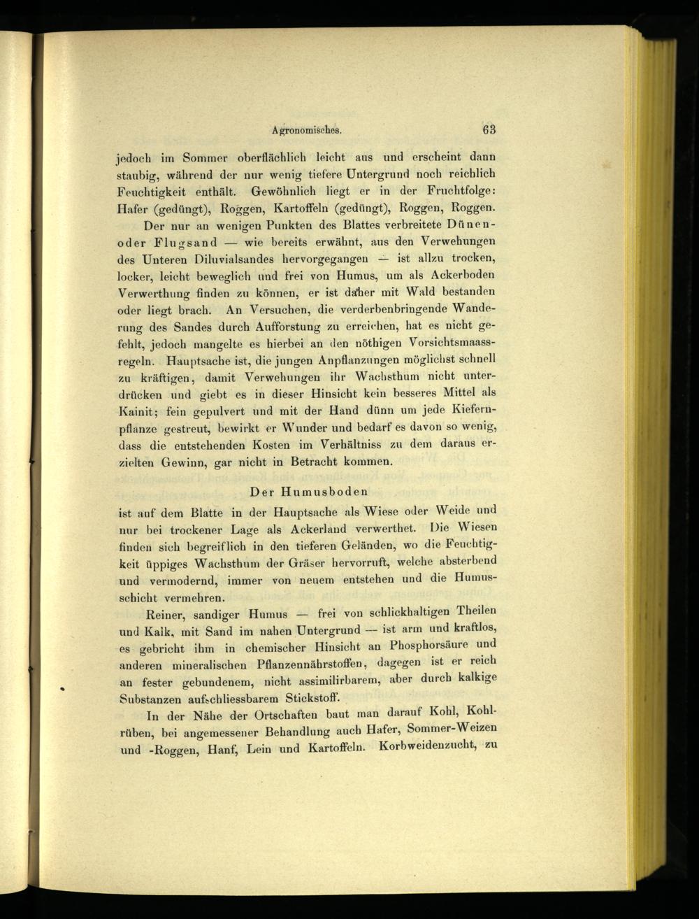 jedoch im Sommer oberflächlich leicht aus und erscheint dann staubig, während der nur wenig tiefere Untergrund noch reichlich Feuchtigkeit enthält. Gewöhnlich liegt er in der Fruchtfolge: Hafer(gedüngt), Roggen, Kartoffeln(gedüngt), Roggen, Roggen.