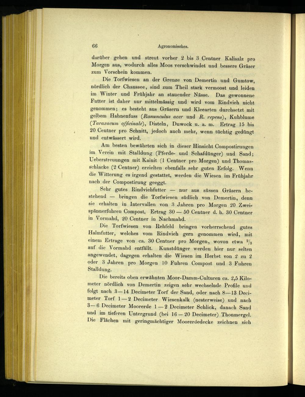 Sehr gutes Rindviehfutter— nur aus süssen Gräsern bestehend— bringen die Torfwiesen südlich von Demertin, denn sie erhalten in Intervallen von 3 Jahren pro Morgen 20 Zweispännerfuhren Compost. Ertrag 30— 50 Centner d. h. 30 Centner in Vormahd, 20 Centner in Nachmahd.