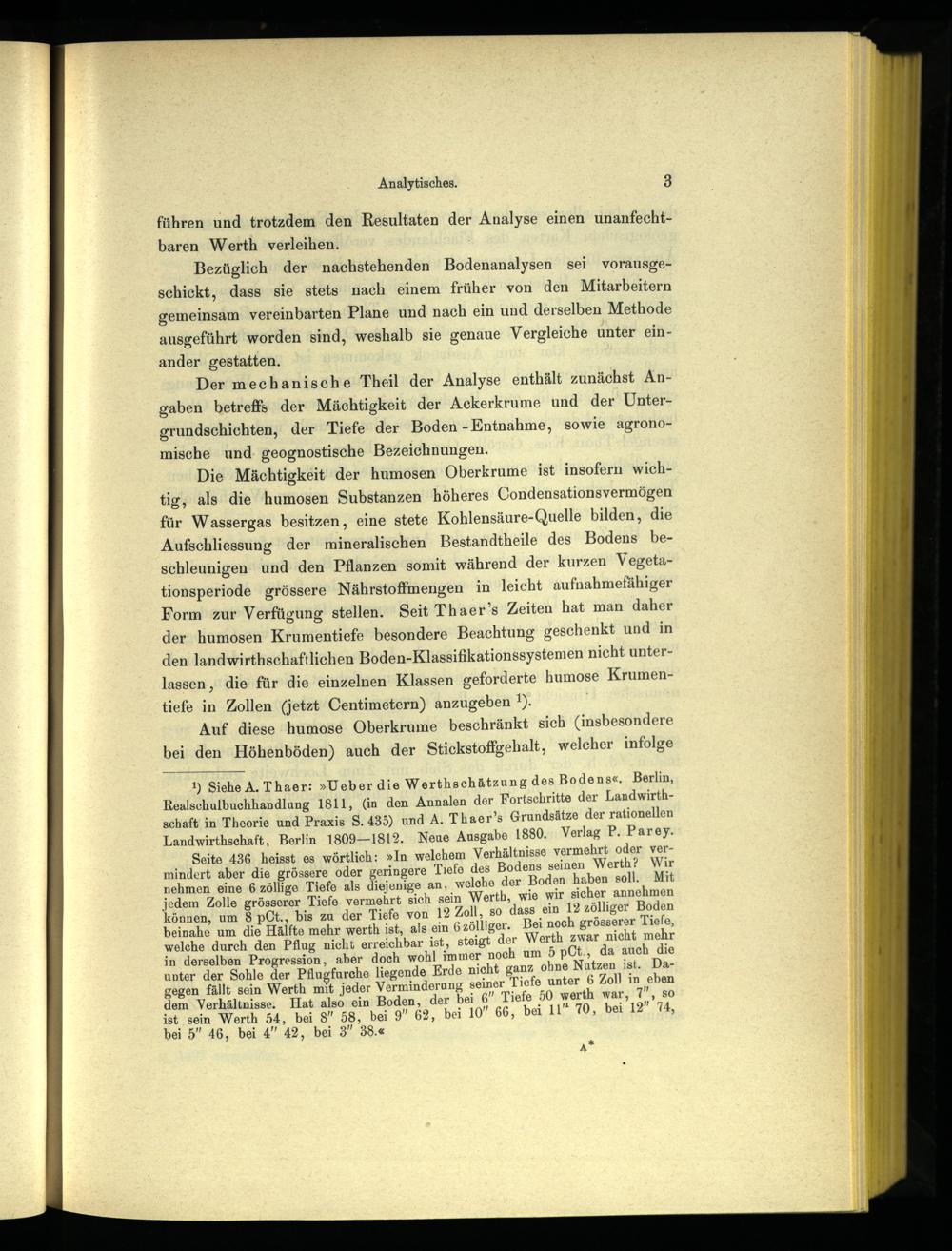 1) Siehe A. Thaer:»Ueber die Werthschätzung des Bodens«. Berlin, Realschulbuchhandlung 1811,(in den Annalen der Fortschritte der Landwirthschaft in Theorie und Praxis S. 435) und A. Thaer’s Grundsätze der rationellen Landwirthschaft, Berlin 1809—181%2. Neue Ausgabe 1880. Verlag P. Parey.