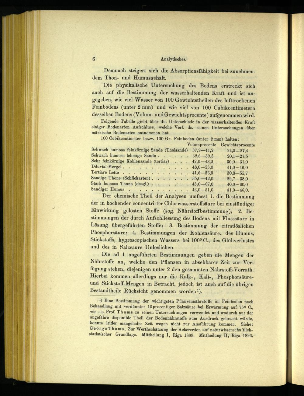 ) Eine Bestimmung der wichtigsten Pflanzennährstoffe im Feinboden nach Behandlung mit verdünnter 10procentiger Salzsäure bei Erwärmung auf 750 C., wie sie Prof. Thoms zu seinen Untersuchungen verwendet und wodurch nur der ungefähre disponible Theil der Bodennährstoffe zum Ausdruck gebracht würde, konnte leider mangelnder Zeit wegen nicht zur Ausführung kommen. Siehe: George Thoms, Zur Werthschätzung der Ackererden auf naturwissenschaftlichstatistischer Grundlage. Mittheilung I, Riga 1888. Mittheilung II, Riga 1893,