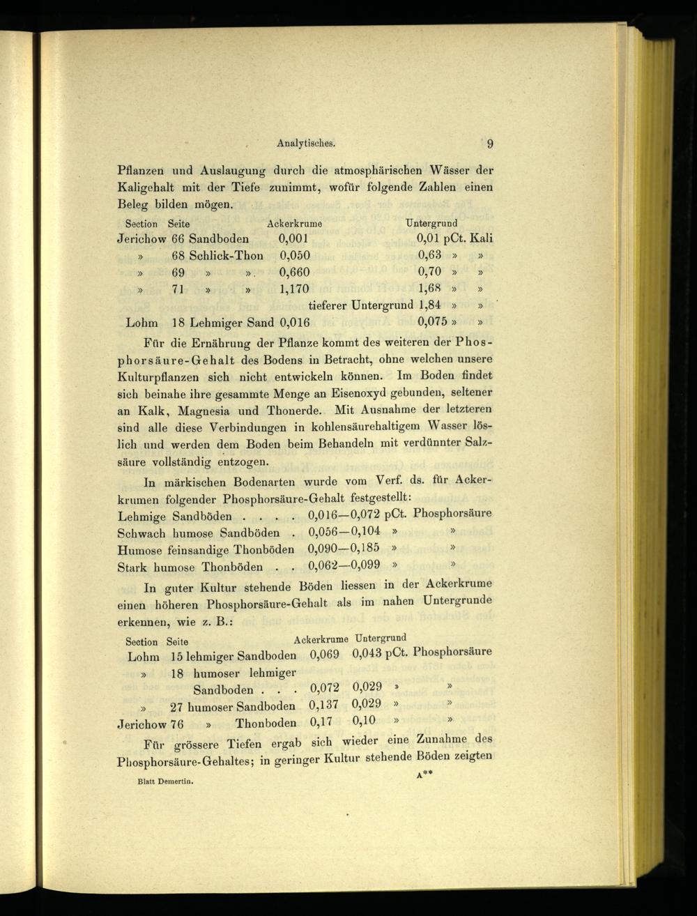 Für die Ernährung der Pflanze kommt des weiteren der Phosphorsäure-Gehalt des Bodens in Betracht, ohne welchen unsere Kulturpflanzen sich nicht entwickeln können. Im Boden findet sich beinahe ihre gesammte Menge an Eisenoxyd gebunden, seltener an Kalk, Magnesia und Thonerde.. Mit Ausnahme der letzteren sind alle diese Verbindungen in kohlensäurehaltigem Wasser löslich und werden dem Boden beim Behandeln mit verdünnter Salzsäure vollständig entzogen.