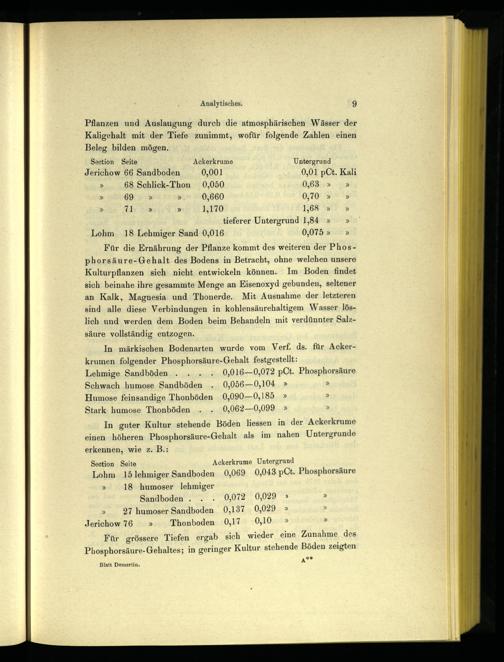 In guter Kultur stehende Böden liessen in der Ackerkrume einen höheren Phosphorsäure-Gehalt als im nahen Untergrunde erkennen, wie z. B.: