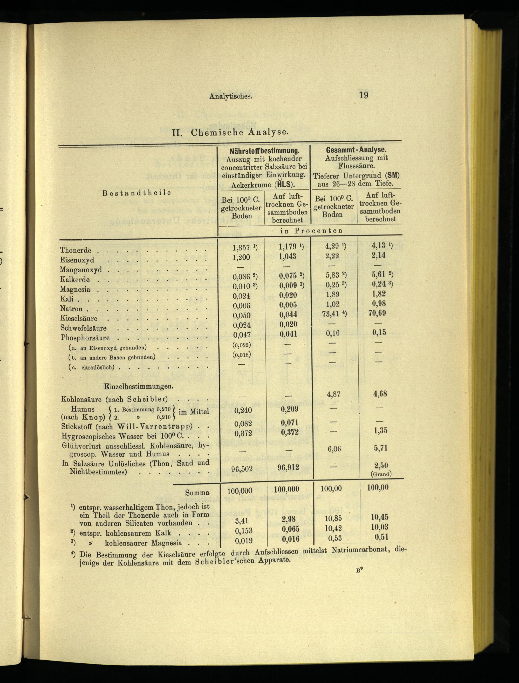 Nährstoff| bestimmung. Gesammt- Analyse. Auszug mit kochender Aufschliessung mit concentrirter Salzsäure bei Flusssäure. einstündiger Einwirkung.| Tieferer Untergrund(SM) Ackerkrume(HLS). aus 26—28 dem Tiefe.