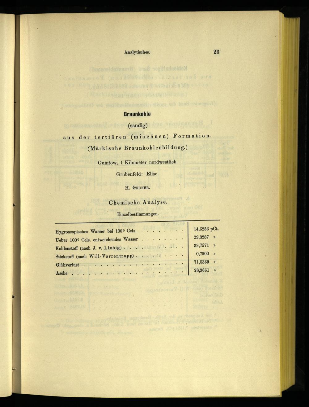Hygroscopisches Wasser bei 1009 Cels. 0. N 14,6253 pCt. Ueber 1000 Cels. entweichendes Wasser...+.++* 29,3287» Kohlenstoff(nach J. v. Liebig): /.‘2. 4340001. He 89,7571» Stickstoff(nach Will-Varrentrapp).+++“+ 0,7900