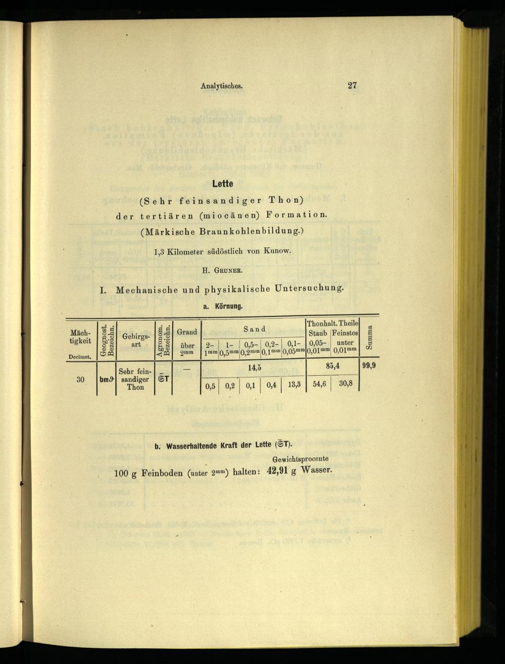 Lette (Sehr feinsandiger Thon) der tertiären(miocänen) Formation. (Märkische Braunkohlenbildung.) 1,3 Kilometer südöstlich von Kunow. H. GRUNER. I. Mechanische und physikalische Untersuchung.